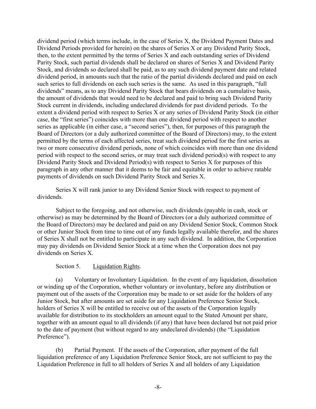 -8- dividend period (which terms include, in the case of Series X, the Dividend Payment Dates and Dividend Periods provided for herein) on the shares of Series X or any Dividend Parity Stock, then, to the extent permitted by the terms of Series X and each outstanding series of Dividend Parity Stock, such partial dividends shall be declared on shares of Series X and Dividend Parity Stock, and dividends so declared shall be paid, as to any such dividend payment date and related dividend period, in amounts such that the ratio of the partial dividends declared and paid on each such series to full dividends on each such series is the same. As used in this paragraph, “full dividends” means, as to any Dividend Parity Stock that bears dividends on a cumulative basis, the amount of dividends that would need to be declared and paid to bring such Dividend Parity Stock current in dividends, including undeclared dividends for past dividend periods. To the extent a dividend period with respect to Series X or any series of Dividend Parity Stock (in either case, the “first series”) coincides with more than one dividend period with respect to another series as applicable (in either case, a “second series”), then, for purposes of this paragraph the Board of Directors (or a duly authorized committee of the Board of Directors) may, to the extent permitted by the terms of each affected series, treat such dividend period for the first series as two or more consecutive dividend periods, none of which coincides with more than one dividend period with respect to the second series, or may treat such dividend period(s) with respect to any Dividend Parity Stock and Dividend Period(s) with respect to Series X for purposes of this paragraph in any other manner that it deems to be fair and equitable in order to achieve ratable payments of dividends on such Dividend Parity Stock and Series X. Series X will rank junior to any Dividend Senior Stock with respect to payment of dividends. Subject to the foregoing, and not otherwise, such dividends (payable in cash, stock or otherwise) as may be determined by the Board of Directors (or a duly authorized committee of the Board of Directors) may be declared and paid on any Dividend Senior Stock, Common Stock or other Junior Stock from time to time out of any funds legally available therefor, and the shares of Series X shall not be entitled to participate in any such dividend. In addition, the Corporation may pay dividends on Dividend Senior Stock at a time when the Corporation does not pay dividends on Series X. Section 5. Liquidation Rights. (a) Voluntary or Involuntary Liquidation. In the event of any liquidation, dissolution or winding up of the Corporation, whether voluntary or involuntary, before any distribution or payment out of the assets of the Corporation may be made to or set aside for the holders of any Junior Stock, but after amounts are set aside for any Liquidation Preference Senior Stock, holders of Series X will be entitled to receive out of the assets of the Corporation legally available for distribution to its stockholders an amount equal to the Stated Amount per share, together with an amount equal to all dividends (if any) that have been declared but not paid prior to the date of payment (but without regard to any undeclared dividends) (the “Liquidation Preference”). (b) Partial Payment. If the assets of the Corporation, after payment of the full liquidation preference of any Liquidation Preference Senior Stock, are not sufficient to pay the Liquidation Preference in full to all holders of Series X and all holders of any Liquidation