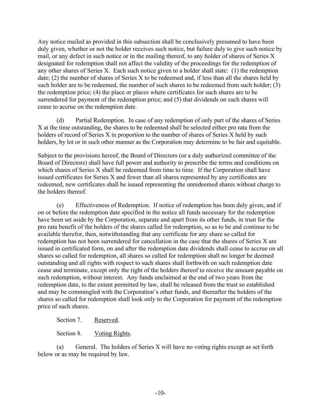-10- Any notice mailed as provided in this subsection shall be conclusively presumed to have been duly given, whether or not the holder receives such notice, but failure duly to give such notice by mail, or any defect in such notice or in the mailing thereof, to any holder of shares of Series X designated for redemption shall not affect the validity of the proceedings for the redemption of any other shares of Series X. Each such notice given to a holder shall state: (1) the redemption date; (2) the number of shares of Series X to be redeemed and, if less than all the shares held by such holder are to be redeemed, the number of such shares to be redeemed from such holder; (3) the redemption price; (4) the place or places where certificates for such shares are to be surrendered for payment of the redemption price; and (5) that dividends on such shares will cease to accrue on the redemption date. (d) Partial Redemption. In case of any redemption of only part of the shares of Series X at the time outstanding, the shares to be redeemed shall be selected either pro rata from the holders of record of Series X in proportion to the number of shares of Series X held by such holders, by lot or in such other manner as the Corporation may determine to be fair and equitable. Subject to the provisions hereof, the Board of Directors (or a duly authorized committee of the Board of Directors) shall have full power and authority to prescribe the terms and conditions on which shares of Series X shall be redeemed from time to time. If the Corporation shall have issued certificates for Series X and fewer than all shares represented by any certificates are redeemed, new certificates shall be issued representing the unredeemed shares without charge to the holders thereof. (e) Effectiveness of Redemption. If notice of redemption has been duly given, and if on or before the redemption date specified in the notice all funds necessary for the redemption have been set aside by the Corporation, separate and apart from its other funds, in trust for the pro rata benefit of the holders of the shares called for redemption, so as to be and continue to be available therefor, then, notwithstanding that any certificate for any share so called for redemption has not been surrendered for cancellation in the case that the shares of Series X are issued in certificated form, on and after the redemption date dividends shall cease to accrue on all shares so called for redemption, all shares so called for redemption shall no longer be deemed outstanding and all rights with respect to such shares shall forthwith on such redemption date cease and terminate, except only the right of the holders thereof to receive the amount payable on such redemption, without interest. Any funds unclaimed at the end of two years from the redemption date, to the extent permitted by law, shall be released from the trust so established and may be commingled with the Corporation’s other funds, and thereafter the holders of the shares so called for redemption shall look only to the Corporation for payment of the redemption price of such shares. Section 7. Reserved. Section 8. Voting Rights. (a) General. The holders of Series X will have no voting rights except as set forth below or as may be required by law.