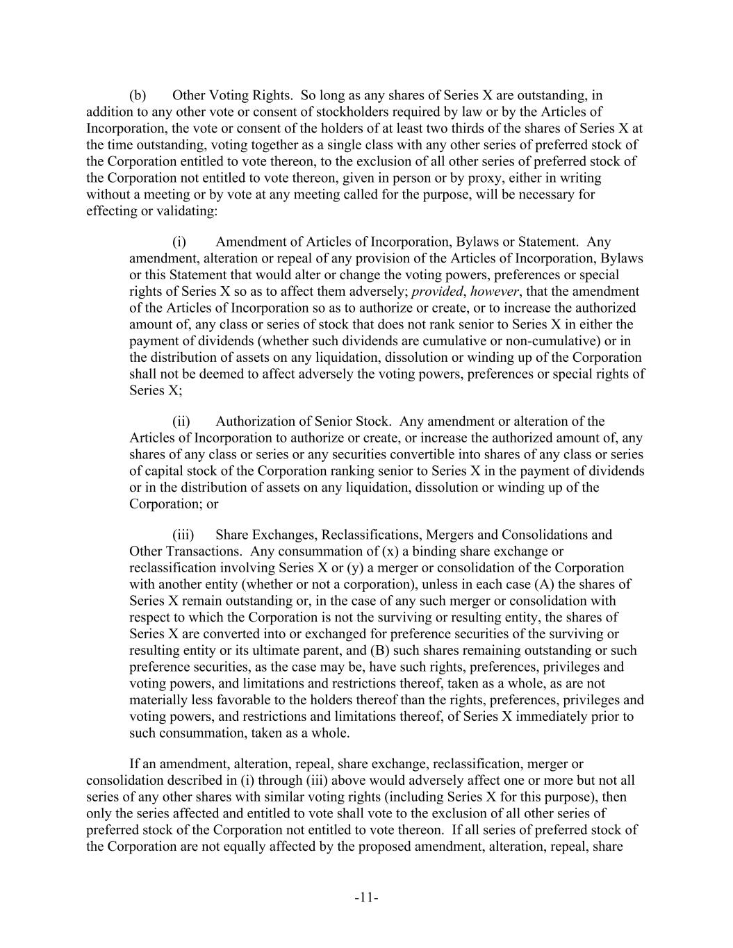 -11- (b) Other Voting Rights. So long as any shares of Series X are outstanding, in addition to any other vote or consent of stockholders required by law or by the Articles of Incorporation, the vote or consent of the holders of at least two thirds of the shares of Series X at the time outstanding, voting together as a single class with any other series of preferred stock of the Corporation entitled to vote thereon, to the exclusion of all other series of preferred stock of the Corporation not entitled to vote thereon, given in person or by proxy, either in writing without a meeting or by vote at any meeting called for the purpose, will be necessary for effecting or validating: (i) Amendment of Articles of Incorporation, Bylaws or Statement. Any amendment, alteration or repeal of any provision of the Articles of Incorporation, Bylaws or this Statement that would alter or change the voting powers, preferences or special rights of Series X so as to affect them adversely; provided, however, that the amendment of the Articles of Incorporation so as to authorize or create, or to increase the authorized amount of, any class or series of stock that does not rank senior to Series X in either the payment of dividends (whether such dividends are cumulative or non-cumulative) or in the distribution of assets on any liquidation, dissolution or winding up of the Corporation shall not be deemed to affect adversely the voting powers, preferences or special rights of Series X; (ii) Authorization of Senior Stock. Any amendment or alteration of the Articles of Incorporation to authorize or create, or increase the authorized amount of, any shares of any class or series or any securities convertible into shares of any class or series of capital stock of the Corporation ranking senior to Series X in the payment of dividends or in the distribution of assets on any liquidation, dissolution or winding up of the Corporation; or (iii) Share Exchanges, Reclassifications, Mergers and Consolidations and Other Transactions. Any consummation of (x) a binding share exchange or reclassification involving Series X or (y) a merger or consolidation of the Corporation with another entity (whether or not a corporation), unless in each case (A) the shares of Series X remain outstanding or, in the case of any such merger or consolidation with respect to which the Corporation is not the surviving or resulting entity, the shares of Series X are converted into or exchanged for preference securities of the surviving or resulting entity or its ultimate parent, and (B) such shares remaining outstanding or such preference securities, as the case may be, have such rights, preferences, privileges and voting powers, and limitations and restrictions thereof, taken as a whole, as are not materially less favorable to the holders thereof than the rights, preferences, privileges and voting powers, and restrictions and limitations thereof, of Series X immediately prior to such consummation, taken as a whole. If an amendment, alteration, repeal, share exchange, reclassification, merger or consolidation described in (i) through (iii) above would adversely affect one or more but not all series of any other shares with similar voting rights (including Series X for this purpose), then only the series affected and entitled to vote shall vote to the exclusion of all other series of preferred stock of the Corporation not entitled to vote thereon. If all series of preferred stock of the Corporation are not equally affected by the proposed amendment, alteration, repeal, share
