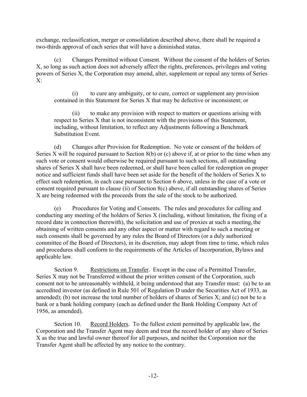 -12- exchange, reclassification, merger or consolidation described above, there shall be required a two-thirds approval of each series that will have a diminished status. (c) Changes Permitted without Consent. Without the consent of the holders of Series X, so long as such action does not adversely affect the rights, preferences, privileges and voting powers of Series X, the Corporation may amend, alter, supplement or repeal any terms of Series X: (i) to cure any ambiguity, or to cure, correct or supplement any provision contained in this Statement for Series X that may be defective or inconsistent; or (ii) to make any provision with respect to matters or questions arising with respect to Series X that is not inconsistent with the provisions of this Statement, including, without limitation, to reflect any Adjustments following a Benchmark Substitution Event. (d) Changes after Provision for Redemption. No vote or consent of the holders of Series X will be required pursuant to Section 8(b) or (c) above if, at or prior to the time when any such vote or consent would otherwise be required pursuant to such sections, all outstanding shares of Series X shall have been redeemed, or shall have been called for redemption on proper notice and sufficient funds shall have been set aside for the benefit of the holders of Series X to effect such redemption, in each case pursuant to Section 6 above, unless in the case of a vote or consent required pursuant to clause (ii) of Section 8(c) above, if all outstanding shares of Series X are being redeemed with the proceeds from the sale of the stock to be authorized. (e) Procedures for Voting and Consents. The rules and procedures for calling and conducting any meeting of the holders of Series X (including, without limitation, the fixing of a record date in connection therewith), the solicitation and use of proxies at such a meeting, the obtaining of written consents and any other aspect or matter with regard to such a meeting or such consents shall be governed by any rules the Board of Directors (or a duly authorized committee of the Board of Directors), in its discretion, may adopt from time to time, which rules and procedures shall conform to the requirements of the Articles of Incorporation, Bylaws and applicable law. Section 9. Restrictions on Transfer. Except in the case of a Permitted Transfer, Series X may not be Transferred without the prior written consent of the Corporation, such consent not to be unreasonably withheld, it being understood that any Transfer must: (a) be to an accredited investor (as defined in Rule 501 of Regulation D under the Securities Act of 1933, as amended); (b) not increase the total number of holders of shares of Series X; and (c) not be to a bank or a bank holding company (each as defined under the Bank Holding Company Act of 1956, as amended). Section 10. Record Holders. To the fullest extent permitted by applicable law, the Corporation and the Transfer Agent may deem and treat the record holder of any share of Series X as the true and lawful owner thereof for all purposes, and neither the Corporation nor the Transfer Agent shall be affected by any notice to the contrary.