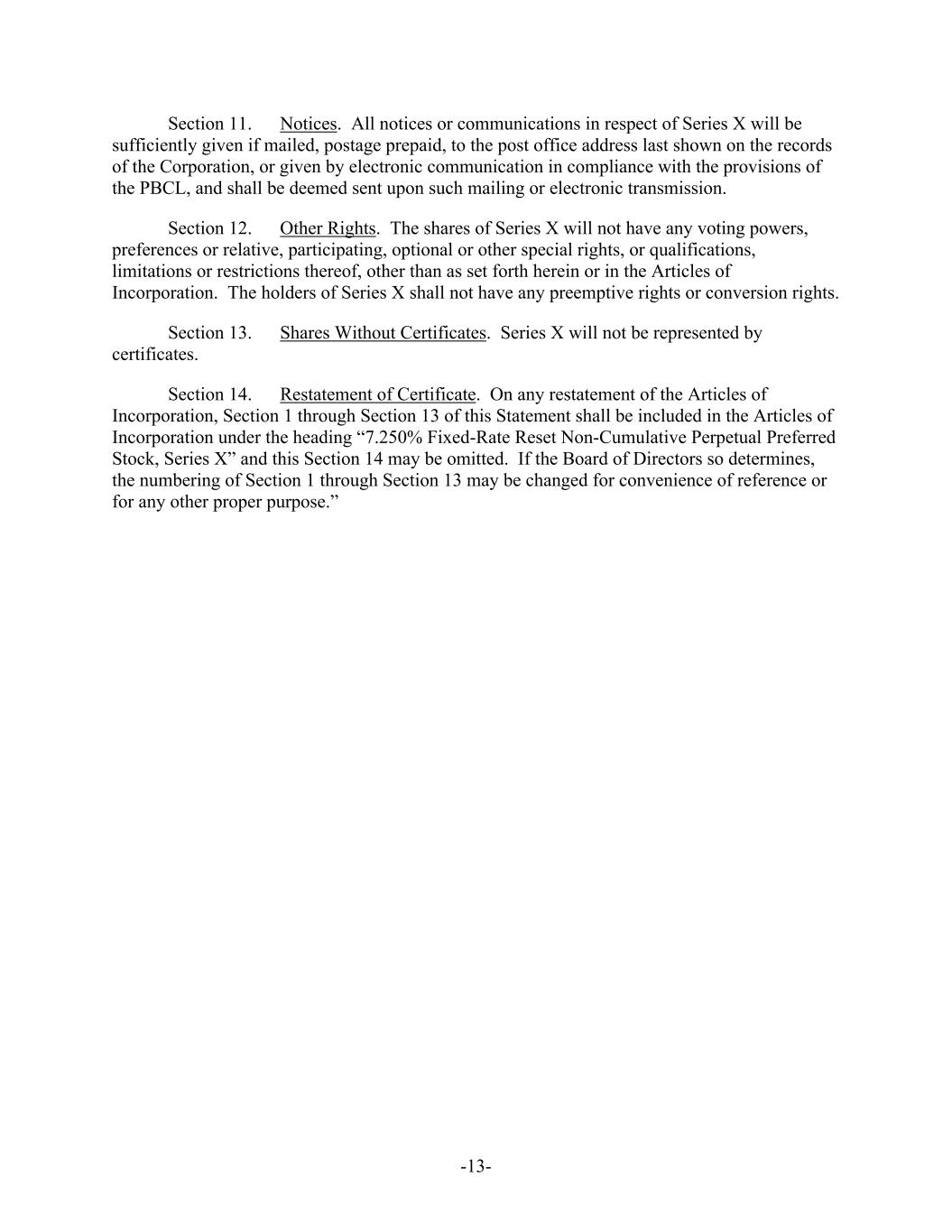 -13- Section 11. Notices. All notices or communications in respect of Series X will be sufficiently given if mailed, postage prepaid, to the post office address last shown on the records of the Corporation, or given by electronic communication in compliance with the provisions of the PBCL, and shall be deemed sent upon such mailing or electronic transmission. Section 12. Other Rights. The shares of Series X will not have any voting powers, preferences or relative, participating, optional or other special rights, or qualifications, limitations or restrictions thereof, other than as set forth herein or in the Articles of Incorporation. The holders of Series X shall not have any preemptive rights or conversion rights. Section 13. Shares Without Certificates. Series X will not be represented by certificates. Section 14. Restatement of Certificate. On any restatement of the Articles of Incorporation, Section 1 through Section 13 of this Statement shall be included in the Articles of Incorporation under the heading “7.250% Fixed-Rate Reset Non-Cumulative Perpetual Preferred Stock, Series X” and this Section 14 may be omitted. If the Board of Directors so determines, the numbering of Section 1 through Section 13 may be changed for convenience of reference or for any other proper purpose.”