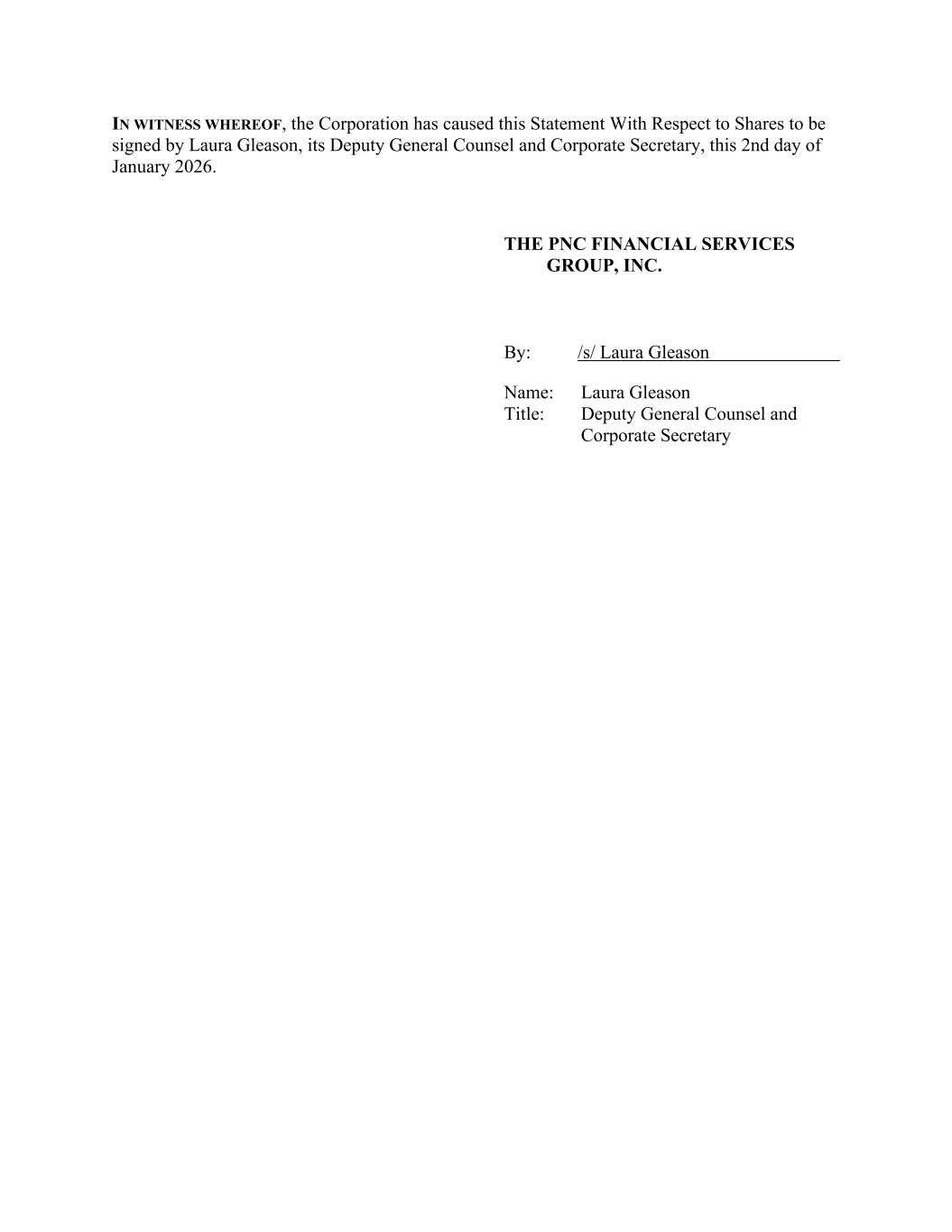 IN WITNESS WHEREOF, the Corporation has caused this Statement With Respect to Shares to be signed by Laura Gleason, its Deputy General Counsel and Corporate Secretary, this 2nd day of January 2026. THE PNC FINANCIAL SERVICES GROUP, INC. By: /s/ Laura Gleason Name: Laura Gleason Title: Deputy General Counsel and Corporate Secretary