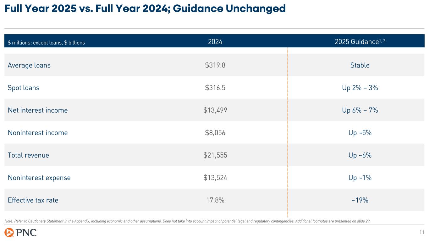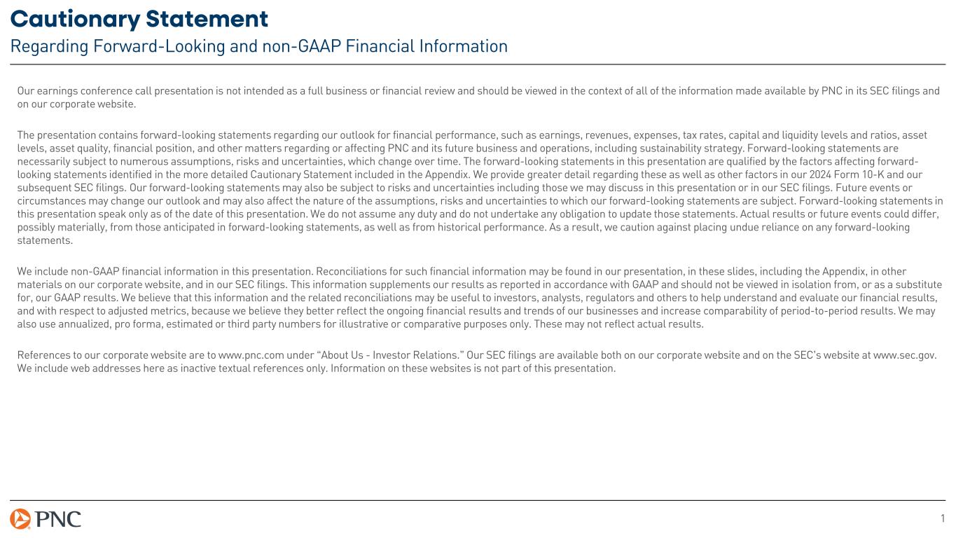 1 Cautionary Statement Regarding Forward-Looking and non-GAAP Financial Information Our earnings conference call presentation is not intended as a full business or financial review and should be viewed in the context of all of the information made available by PNC in its SEC filings and on our corporate website. The presentation contains forward-looking statements regarding our outlook for financial performance, such as earnings, revenues, expenses, tax rates, capital and liquidity levels and ratios, asset levels, asset quality, financial position, and other matters regarding or affecting PNC and its future business and operations, including sustainability strategy. Forward-looking statements are necessarily subject to numerous assumptions, risks and uncertainties, which change over time. The forward-looking statements in this presentation are qualified by the factors affecting forward- looking statements identified in the more detailed Cautionary Statement included in the Appendix. We provide greater detail regarding these as well as other factors in our 2024 Form 10-K and our subsequent SEC filings. Our forward-looking statements may also be subject to risks and uncertainties including those we may discuss in this presentation or in our SEC filings. Future events or circumstances may change our outlook and may also affect the nature of the assumptions, risks and uncertainties to which our forward-looking statements are subject. Forward-looking statements in this presentation speak only as of the date of this presentation. We do not assume any duty and do not undertake any obligation to update those statements. Actual results or future events could differ, possibly materially, from those anticipated in forward-looking statements, as well as from historical performance. As a result, we caution against placing undue reliance on any forward-looking statements. We include non-GAAP financial information in this presentation. Reconciliations for such financial information may be found in our presentation, in these slides, including the Appendix, in other materials on our corporate website, and in our SEC filings. This information supplements our results as reported in accordance with GAAP and should not be viewed in isolation from, or as a substitute for, our GAAP results. We believe that this information and the related reconciliations may be useful to investors, analysts, regulators and others to help understand and evaluate our financial results, and with respect to adjusted metrics, because we believe they better reflect the ongoing financial results and trends of our businesses and increase comparability of period-to-period results. We may also use annualized, pro forma, estimated or third party numbers for illustrative or comparative purposes only. These may not reflect actual results. References to our corporate website are to www.pnc.com under “About Us - Investor Relations.” Our SEC filings are available both on our corporate website and on the SEC’s website at www.sec.gov. We include web addresses here as inactive textual references only. Information on these websites is not part of this presentation.