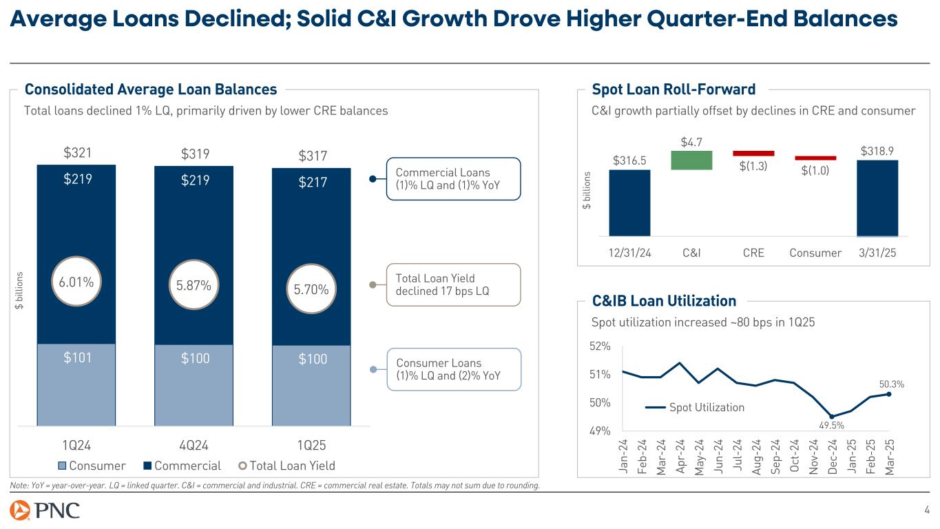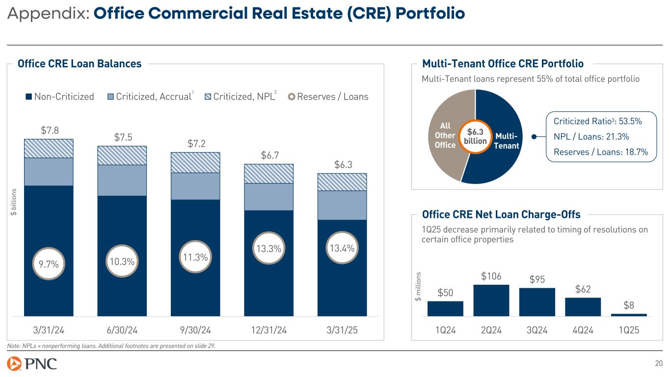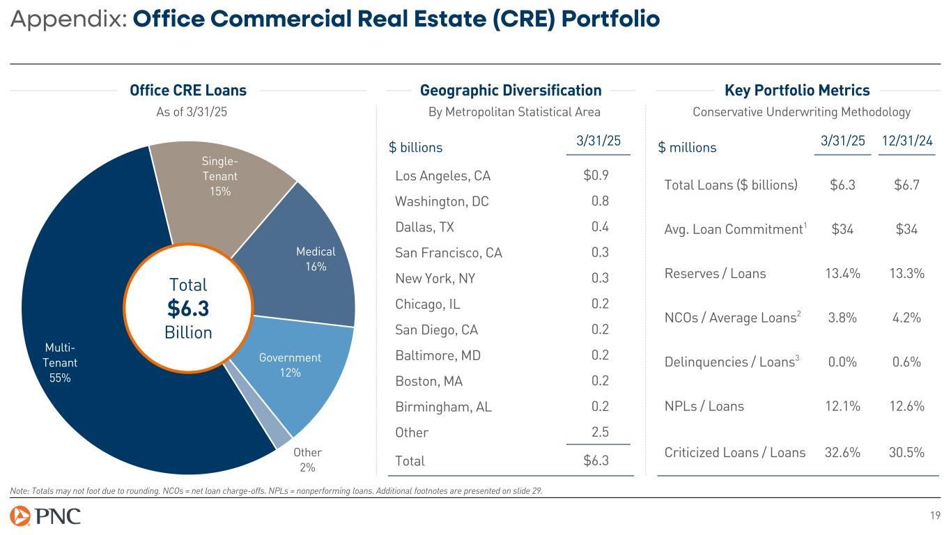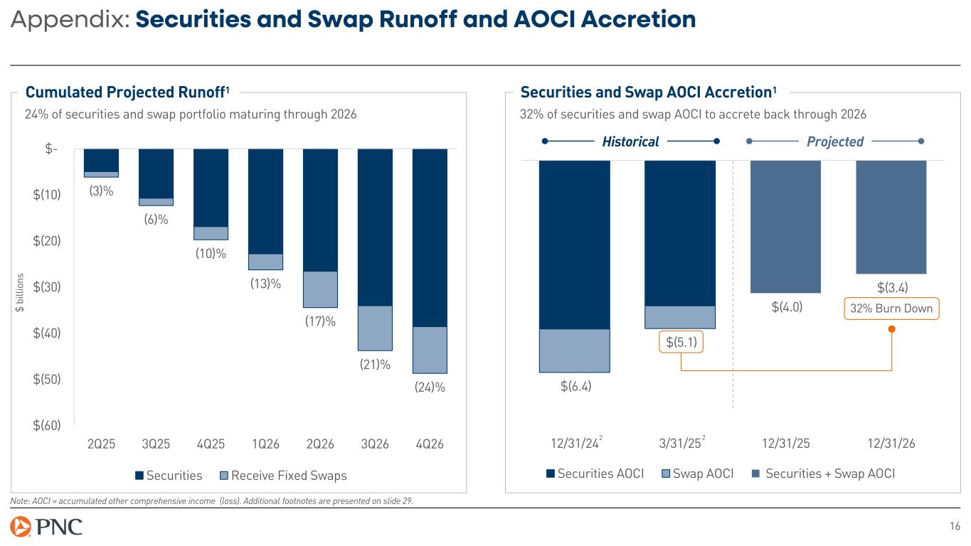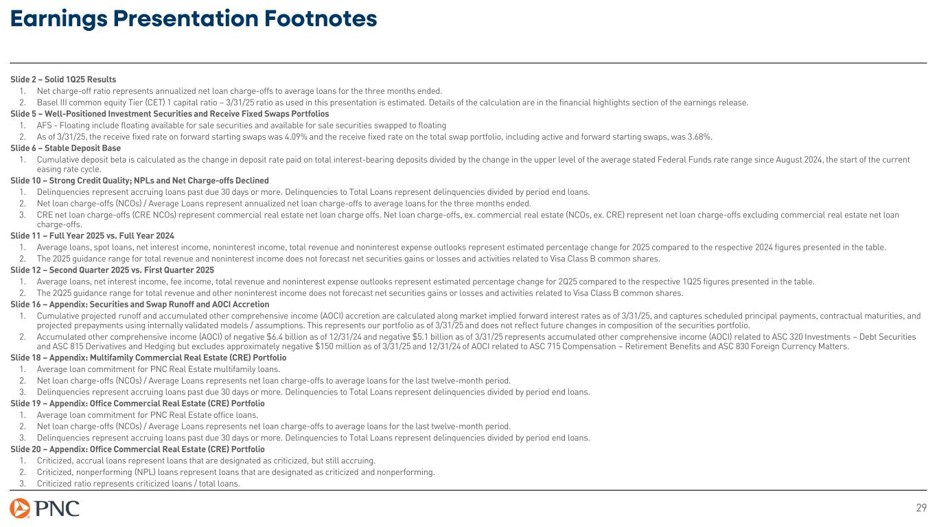 29 Earnings Presentation Footnotes Slide 2 – Solid 1Q25 Results 1. Net charge-off ratio represents annualized net loan charge-offs to average loans for the three months ended. 2. Basel III common equity Tier (CET) 1 capital ratio – 3/31/25 ratio as used in this presentation is estimated. Details of the calculation are in the financial highlights section of the earnings release. Slide 5 – Well-Positioned Investment Securities and Receive Fixed Swaps Portfolios 1. AFS - Floating include floating available for sale securities and available for sale securities swapped to floating 2. As of 3/31/25, the receive fixed rate on forward starting swaps was 4.09% and the receive fixed rate on the total swap portfolio, including active and forward starting swaps, was 3.68%. Slide 6 – Stable Deposit Base 1. Cumulative deposit beta is calculated as the change in deposit rate paid on total interest-bearing deposits divided by the change in the upper level of the average stated Federal Funds rate range since August 2024, the start of the current easing rate cycle. Slide 10 – Strong Credit Quality; NPLs and Net Charge-offs Declined 1. Delinquencies represent accruing loans past due 30 days or more. Delinquencies to Total Loans represent delinquencies divided by period end loans. 2. Net loan charge-offs (NCOs) / Average Loans represent annualized net loan charge-offs to average loans for the three months ended. 3. CRE net loan charge-offs (CRE NCOs) represent commercial real estate net loan charge offs. Net loan charge-offs, ex. commercial real estate (NCOs, ex. CRE) represent net loan charge-offs excluding commercial real estate net loan charge-offs. Slide 11 – Full Year 2025 vs. Full Year 2024 1. Average loans, spot loans, net interest income, noninterest income, total revenue and noninterest expense outlooks represent estimated percentage change for 2025 compared to the respective 2024 figures presented in the table. 2. The 2025 guidance range for total revenue and noninterest income does not forecast net securities gains or losses and activities related to Visa Class B common shares. Slide 12 – Second Quarter 2025 vs. First Quarter 2025 1. Average loans, net interest income, fee income, total revenue and noninterest expense outlooks represent estimated percentage change for 2Q25 compared to the respective 1Q25 figures presented in the table. 2. The 2Q25 guidance range for total revenue and other noninterest income does not forecast net securities gains or losses and activities related to Visa Class B common shares. Slide 16 – Appendix: Securities and Swap Runoff and AOCI Accretion 1. Cumulative projected runoff and accumulated other comprehensive income (AOCI) accretion are calculated along market implied forward interest rates as of 3/31/25, and captures scheduled principal payments, contractual maturities, and projected prepayments using internally validated models / assumptions. This represents our portfolio as of 3/31/25 and does not reflect future changes in composition of the securities portfolio. 2. Accumulated other comprehensive income (AOCI) of negative $6.4 billion as of 12/31/24 and negative $5.1 billion as of 3/31/25 represents accumulated other comprehensive income (AOCI) related to ASC 320 Investments – Debt Securities and ASC 815 Derivatives and Hedging but excludes approximately negative $150 million as of 3/31/25 and 12/31/24 of AOCI related to ASC 715 Compensation – Retirement Benefits and ASC 830 Foreign Currency Matters. Slide 18 – Appendix: Multifamily Commercial Real Estate (CRE) Portfolio 1. Average loan commitment for PNC Real Estate multifamily loans. 2. Net loan charge-offs (NCOs) / Average Loans represents net loan charge-offs to average loans for the last twelve-month period. 3. Delinquencies represent accruing loans past due 30 days or more. Delinquencies to Total Loans represent delinquencies divided by period end loans. Slide 19 – Appendix: Office Commercial Real Estate (CRE) Portfolio 1. Average loan commitment for PNC Real Estate office loans. 2. Net loan charge-offs (NCOs) / Average Loans represents net loan charge-offs to average loans for the last twelve-month period. 3. Delinquencies represent accruing loans past due 30 days or more. Delinquencies to Total Loans represent delinquencies divided by period end loans. Slide 20 – Appendix: Office Commercial Real Estate (CRE) Portfolio 1. Criticized, accrual loans represent loans that are designated as criticized, but still accruing. 2. Criticized, nonperforming (NPL) loans represent loans that are designated as criticized and nonperforming. 3. Criticized ratio represents criticized loans / total loans.