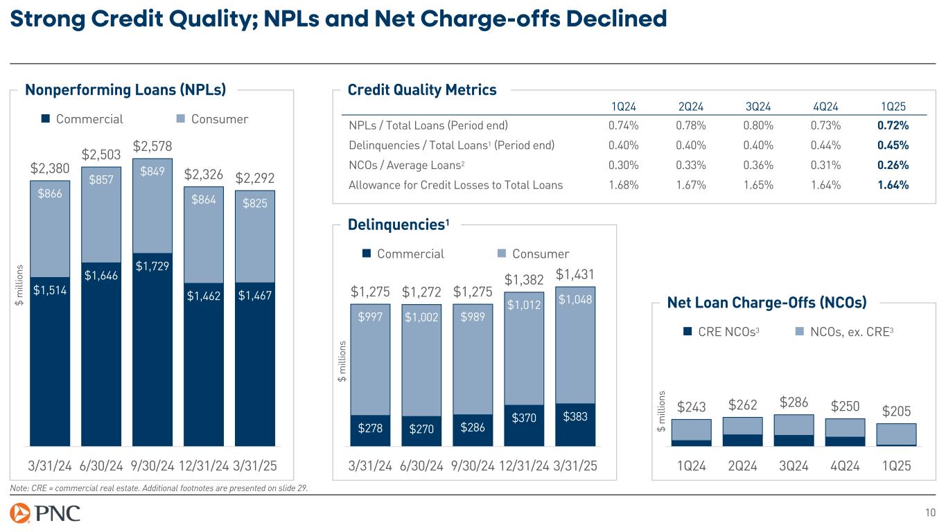 9 Well-Controlled Noninterest Expense Noninterest Expense $3,334 $3,506 $3,387 1Q24 4Q24 1Q25 Linked Quarter Year over Year $ millions 1Q25 $ % $ % Personnel $1,890 $33 2% $96 5% Occupancy 245 5 2% 1 – Equipment 384 (89) (19)% 43 13% Marketing 85 (27) (24)% 21 33% Other 783 (41) (5)% (108) (12)% Total noninterest expense $3,387 $(119) (3)% $53 2% Detail of Noninterest Expense $ m ill io ns