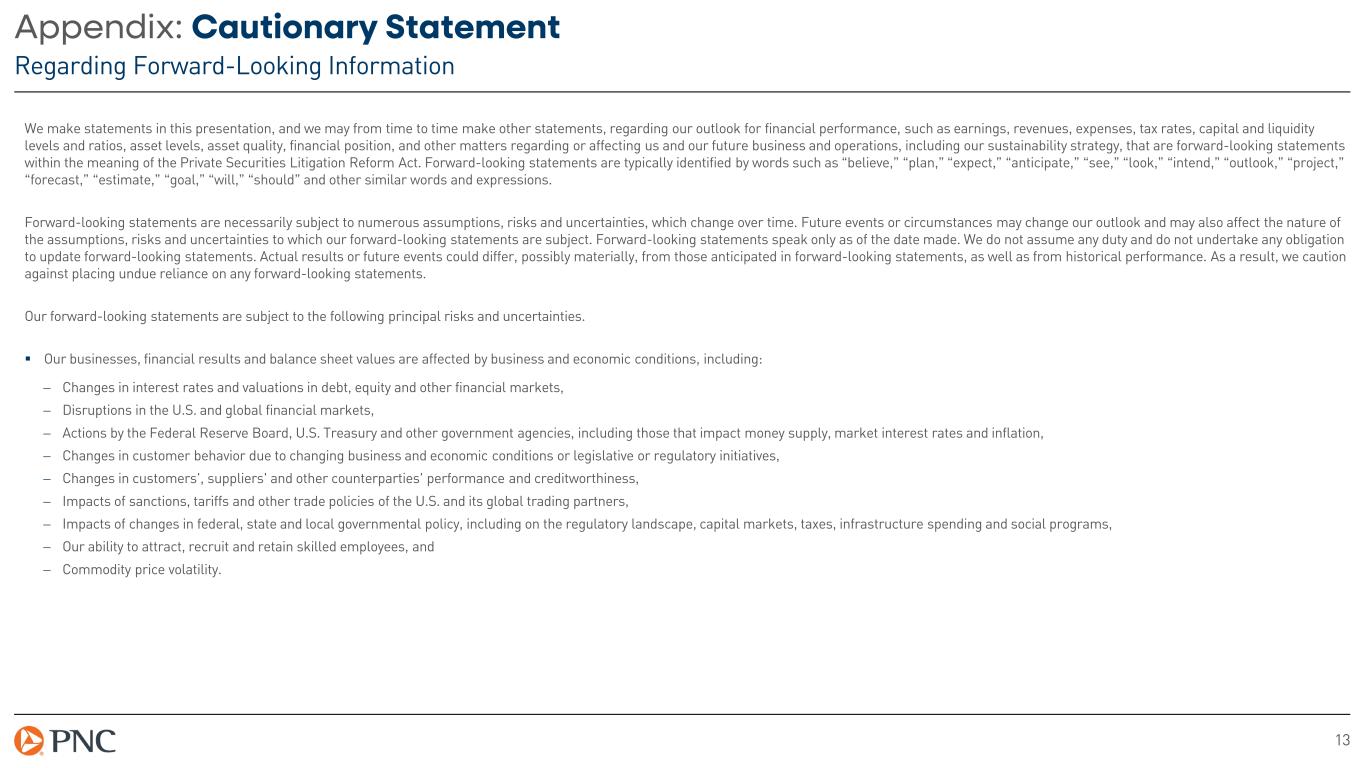 15 Appendix: Cautionary Statement Regarding Forward-Looking Information − Results of the regulatory examination and supervision process, including our failure to satisfy requirements of agreements with governmental agencies. − Costs associated with obtaining rights in intellectual property claimed by others and of adequacy of our intellectual property protection in general.  Business and operating results are affected by our ability to identify and effectively manage risks inherent in our businesses, including, where appropriate, through effective use of systems and controls, third-party insurance, derivatives, and capital management techniques, and to meet evolving regulatory capital and liquidity standards.  Our reputation and business and operating results may be affected by our ability to appropriately meet or address environmental, social or governance targets, goals, commitments or concerns that may arise.  We grow our business in part through acquisitions and new strategic initiatives. Risks and uncertainties include those presented by the nature of the business acquired and strategic initiative, including in some cases those associated with our entry into new businesses or new geographic or other markets and risks resulting from our inexperience in those new areas, as well as risks and uncertainties related to the acquisition transactions themselves, regulatory issues, the integration of the acquired businesses into PNC after closing or any failure to execute strategic or operational plans.  Competition can have an impact on customer acquisition, growth and retention and on credit spreads and product pricing, which can affect market share, deposits and revenues. Our ability to anticipate and respond to technological changes can also impact our ability to respond to customer needs and meet competitive demands.  Business and operating results can also be affected by widespread manmade, natural and other disasters (including severe weather events), health emergencies, dislocations, geopolitical instabilities or events, terrorist activities, system failures or disruptions, security breaches, cyberattacks, international hostilities, or other extraordinary events beyond PNC's control through impacts on the economy and financial markets generally or on us or our counterparties, customers or third-party vendors and service providers specifically. We provide greater detail regarding these as well as other factors in our 2024 Form 10-K, including in the Risk Factors and Risk Management sections and the Legal Proceedings and Commitments Notes of the Notes To Consolidated Financial Statements, and in our subsequent SEC filings. Our forward-looking statements may also be subject to other risks and uncertainties, including those we may discuss elsewhere in this news release or in our SEC filings, accessible on the SEC's website at www.sec.gov and on our corporate website at www.pnc.com/secfilings. We have included these web addresses as inactive textual references only. Information on these websites is not part of this document.