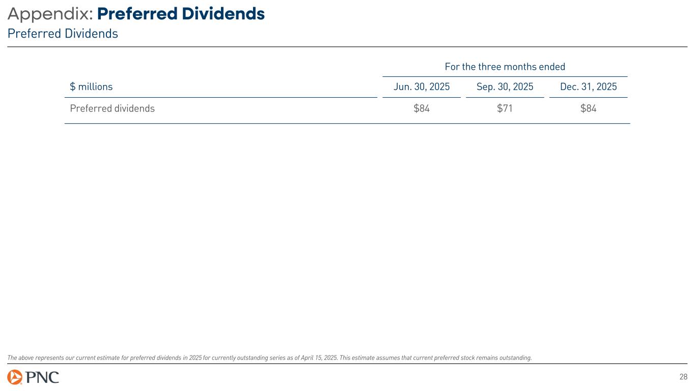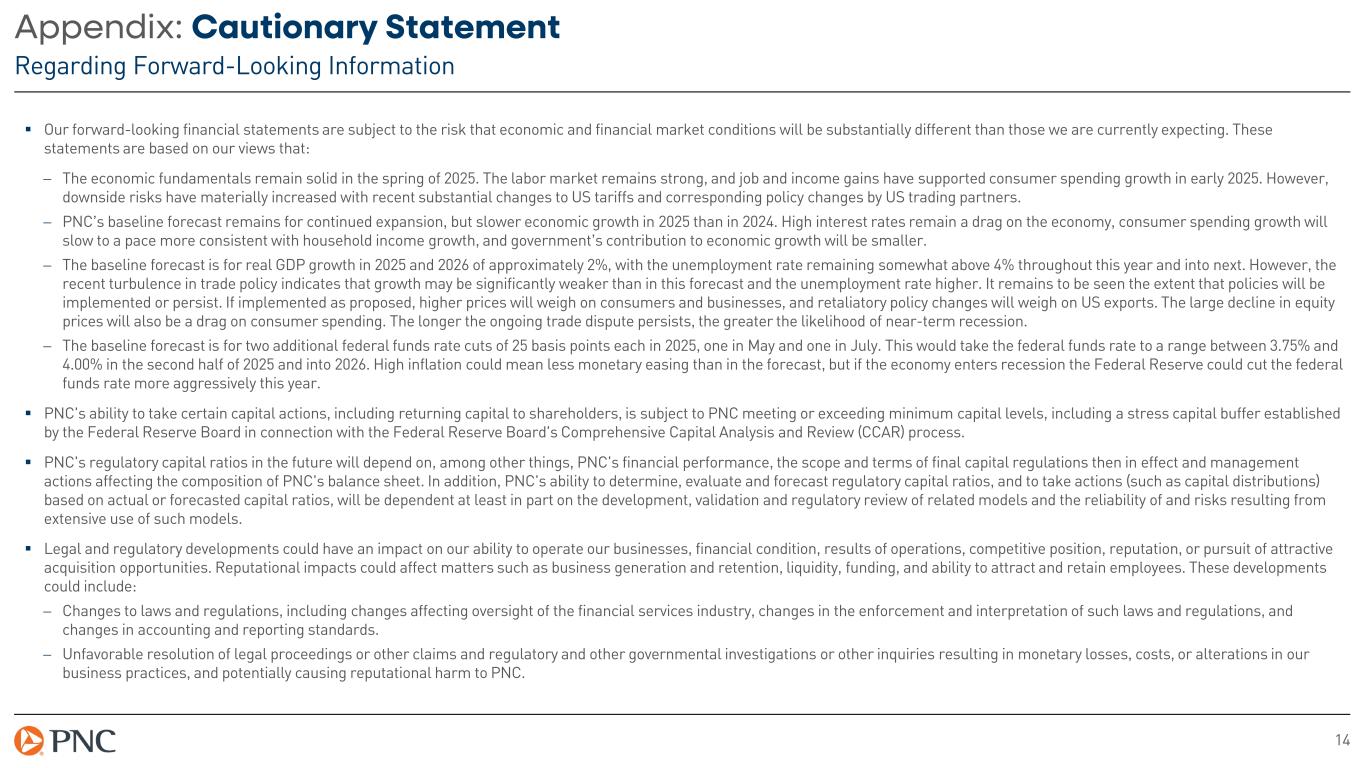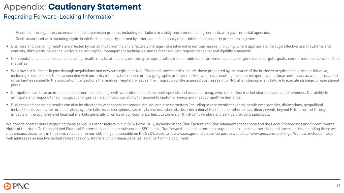 14 Appendix: Cautionary Statement Regarding Forward-Looking Information  Our forward-looking financial statements are subject to the risk that economic and financial market conditions will be substantially different than those we are currently expecting. These statements are based on our views that: − The economic fundamentals remain solid in the spring of 2025. The labor market remains strong, and job and income gains have supported consumer spending growth in early 2025. However, downside risks have materially increased with recent substantial changes to US tariffs and corresponding policy changes by US trading partners. − PNC’s baseline forecast remains for continued expansion, but slower economic growth in 2025 than in 2024. High interest rates remain a drag on the economy, consumer spending growth will slow to a pace more consistent with household income growth, and government’s contribution to economic growth will be smaller. − The baseline forecast is for real GDP growth in 2025 and 2026 of approximately 2%, with the unemployment rate remaining somewhat above 4% throughout this year and into next. However, the recent turbulence in trade policy indicates that growth may be significantly weaker than in this forecast and the unemployment rate higher. It remains to be seen the extent that policies will be implemented or persist. If implemented as proposed, higher prices will weigh on consumers and businesses, and retaliatory policy changes will weigh on US exports. The large decline in equity prices will also be a drag on consumer spending. The longer the ongoing trade dispute persists, the greater the likelihood of near-term recession. − The baseline forecast is for two additional federal funds rate cuts of 25 basis points each in 2025, one in May and one in July. This would take the federal funds rate to a range between 3.75% and 4.00% in the second half of 2025 and into 2026. High inflation could mean less monetary easing than in the forecast, but if the economy enters recession the Federal Reserve could cut the federal funds rate more aggressively this year.  PNC's ability to take certain capital actions, including returning capital to shareholders, is subject to PNC meeting or exceeding minimum capital levels, including a stress capital buffer established by the Federal Reserve Board in connection with the Federal Reserve Board's Comprehensive Capital Analysis and Review (CCAR) process.  PNC's regulatory capital ratios in the future will depend on, among other things, PNC's financial performance, the scope and terms of final capital regulations then in effect and management actions affecting the composition of PNC's balance sheet. In addition, PNC's ability to determine, evaluate and forecast regulatory capital ratios, and to take actions (such as capital distributions) based on actual or forecasted capital ratios, will be dependent at least in part on the development, validation and regulatory review of related models and the reliability of and risks resulting from extensive use of such models.  Legal and regulatory developments could have an impact on our ability to operate our businesses, financial condition, results of operations, competitive position, reputation, or pursuit of attractive acquisition opportunities. Reputational impacts could affect matters such as business generation and retention, liquidity, funding, and ability to attract and retain employees. These developments could include: − Changes to laws and regulations, including changes affecting oversight of the financial services industry, changes in the enforcement and interpretation of such laws and regulations, and changes in accounting and reporting standards. − Unfavorable resolution of legal proceedings or other claims and regulatory and other governmental investigations or other inquiries resulting in monetary losses, costs, or alterations in our business practices, and potentially causing reputational harm to PNC.