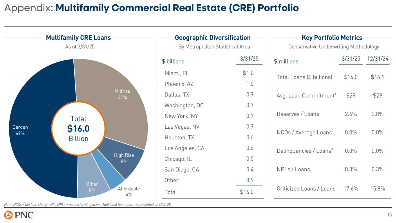17 Appendix: Commercial Real Estate (CRE) Portfolio CRE Portfolio Represents 10% of Total Loans Note: Totals may not sum due to rounding. As of 3/31/25 Total Loans Commercial Real Estate 10% Total $318.9 Billion PNC Commercial Real Estate Portfolio $ billions 3/31/25 % of Total Loans Multifamily $16.0 5.0% Office 6.3 2.0% Industrial / Warehouse 3.6 1.1% Retail 2.0 0.6% Hotel / Motel 1.6 0.5% Seniors Housing 1.5 0.5% Other 1.4 0.5% Total $32.3 10.1%