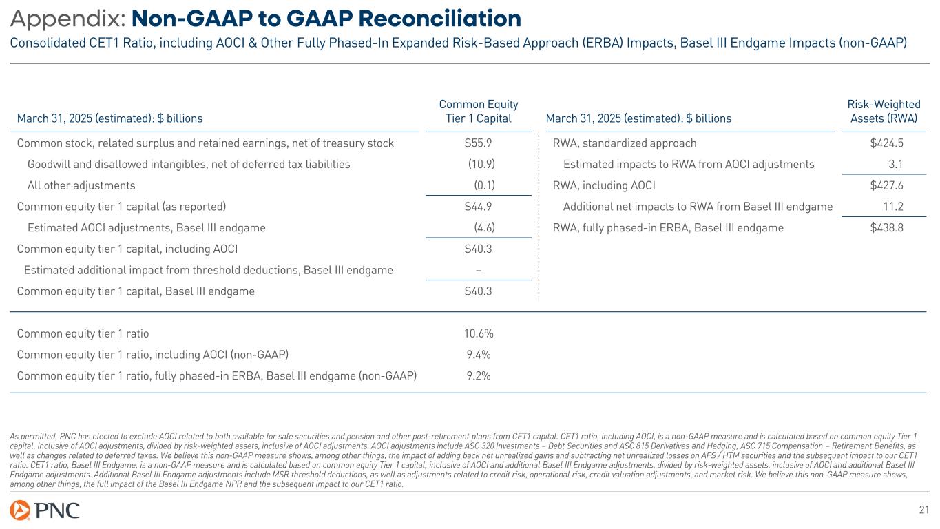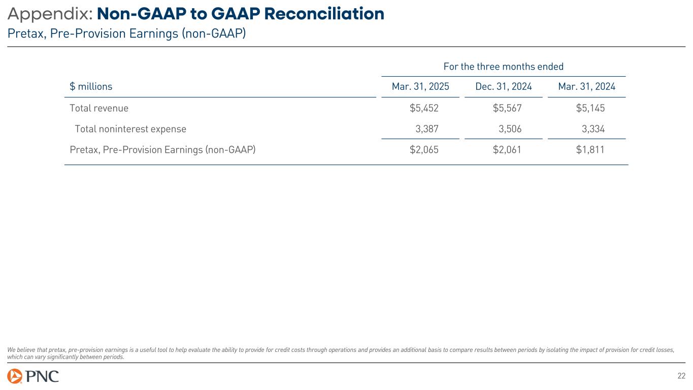 21 Appendix: Non-GAAP to GAAP Reconciliation Consolidated CET1 Ratio, including AOCI & Other Fully Phased-In Expanded Risk-Based Approach (ERBA) Impacts, Basel III Endgame Impacts (non-GAAP) As permitted, PNC has elected to exclude AOCI related to both available for sale securities and pension and other post-retirement plans from CET1 capital. CET1 ratio, including AOCI, is a non-GAAP measure and is calculated based on common equity Tier 1 capital, inclusive of AOCI adjustments, divided by risk-weighted assets, inclusive of AOCI adjustments. AOCI adjustments include ASC 320 Investments – Debt Securities and ASC 815 Derivatives and Hedging, ASC 715 Compensation – Retirement Benefits, as well as changes related to deferred taxes. We believe this non-GAAP measure shows, among other things, the impact of adding back net unrealized gains and subtracting net unrealized losses on AFS / HTM securities and the subsequent impact to our CET1 ratio. CET1 ratio, Basel III Endgame, is a non-GAAP measure and is calculated based on common equity Tier 1 capital, inclusive of AOCI and additional Basel III Endgame adjustments, divided by risk-weighted assets, inclusive of AOCI and additional Basel III Endgame adjustments. Additional Basel III Endgame adjustments include MSR threshold deductions, as well as adjustments related to credit risk, operational risk, credit valuation adjustments, and market risk. We believe this non-GAAP measure shows, among other things, the full impact of the Basel III Endgame NPR and the subsequent impact to our CET1 ratio. March 31, 2025 (estimated): $ billions Common Equity Tier 1 Capital March 31, 2025 (estimated): $ billions Risk-Weighted Assets (RWA) Common stock, related surplus and retained earnings, net of treasury stock $55.9 RWA, standardized approach $424.5 Goodwill and disallowed intangibles, net of deferred tax liabilities (10.9) Estimated impacts to RWA from AOCI adjustments 3.1 All other adjustments (0.1) RWA, including AOCI $427.6 Common equity tier 1 capital (as reported) $44.9 Additional net impacts to RWA from Basel III endgame 11.2 Estimated AOCI adjustments, Basel III endgame (4.6) RWA, fully phased-in ERBA, Basel III endgame $438.8 Common equity tier 1 capital, including AOCI $40.3 Estimated additional impact from threshold deductions, Basel III endgame – Common equity tier 1 capital, Basel III endgame $40.3 Common equity tier 1 ratio 10.6% Common equity tier 1 ratio, including AOCI (non-GAAP) 9.4% Common equity tier 1 ratio, fully phased-in ERBA, Basel III endgame (non-GAAP) 9.2%
