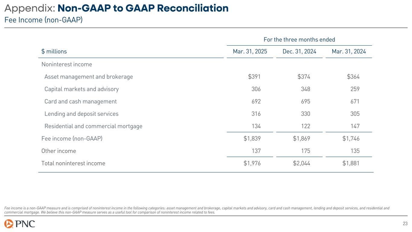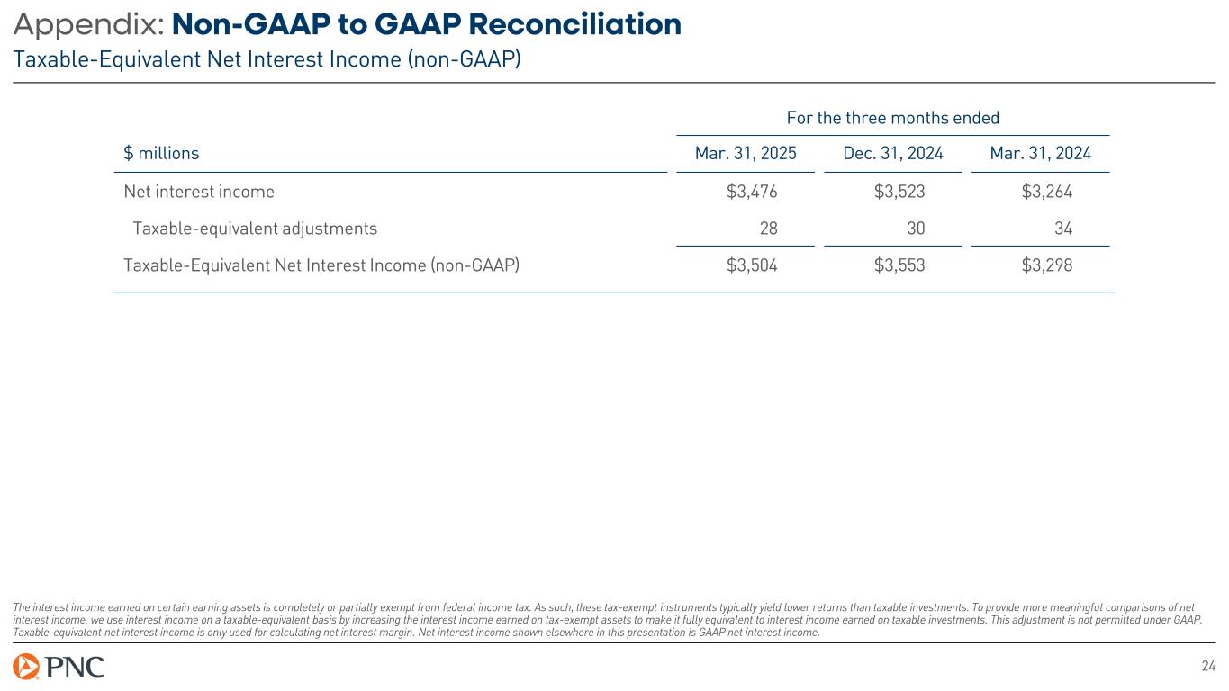 23 Appendix: Non-GAAP to GAAP Reconciliation Fee Income (non-GAAP) For the three months ended $ millions Mar. 31, 2025 Dec. 31, 2024 Mar. 31, 2024 Noninterest income Asset management and brokerage $391 $374 $364 Capital markets and advisory 306 348 259 Card and cash management 692 695 671 Lending and deposit services 316 330 305 Residential and commercial mortgage 134 122 147 Fee income (non-GAAP) $1,839 $1,869 $1,746 Other income 137 175 135 Total noninterest income $1,976 $2,044 $1,881 Fee income is a non-GAAP measure and is comprised of noninterest income in the following categories: asset management and brokerage, capital markets and advisory, card and cash management, lending and deposit services, and residential and commercial mortgage. We believe this non-GAAP measure serves as a useful tool for comparison of noninterest income related to fees.