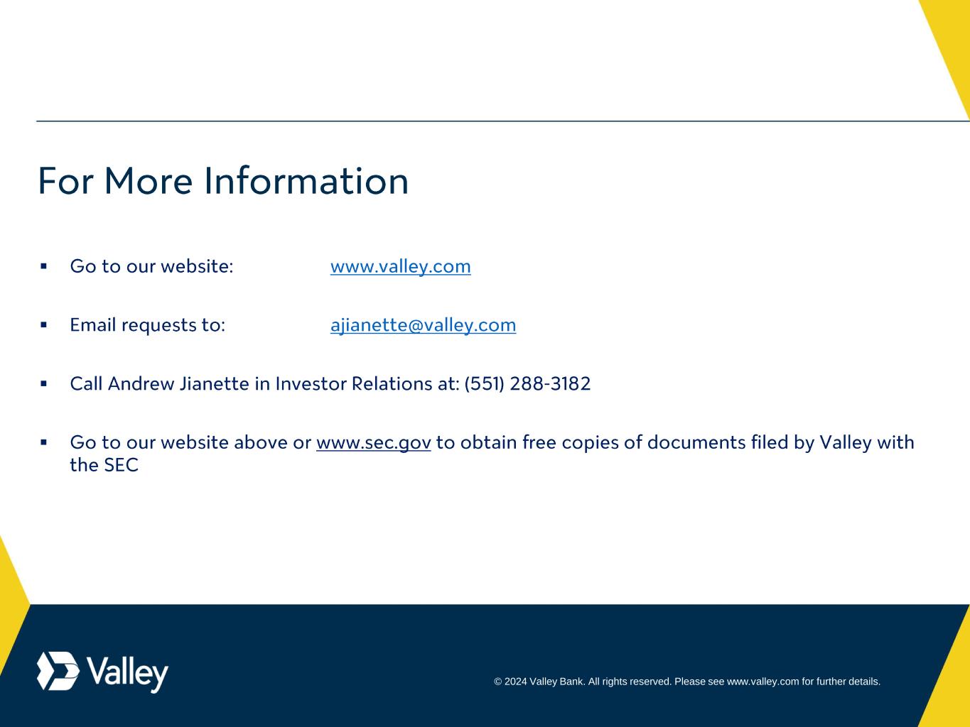 © 2024 Valley Bank. All rights reserved. Please see www.valley.com for further details. ▪ ▪ ▪ ▪