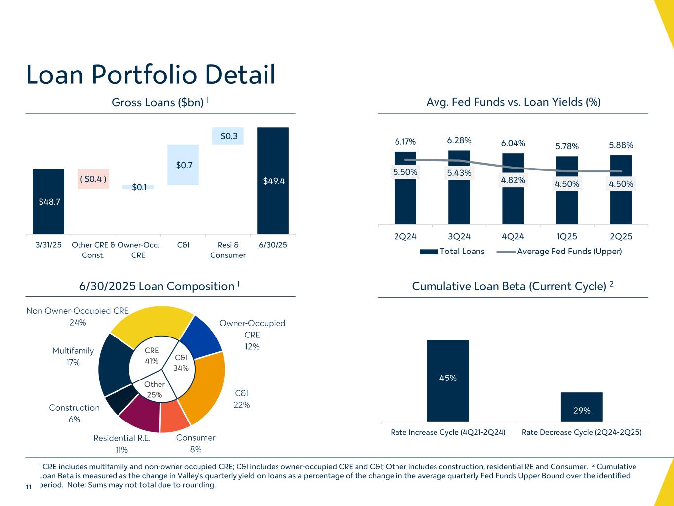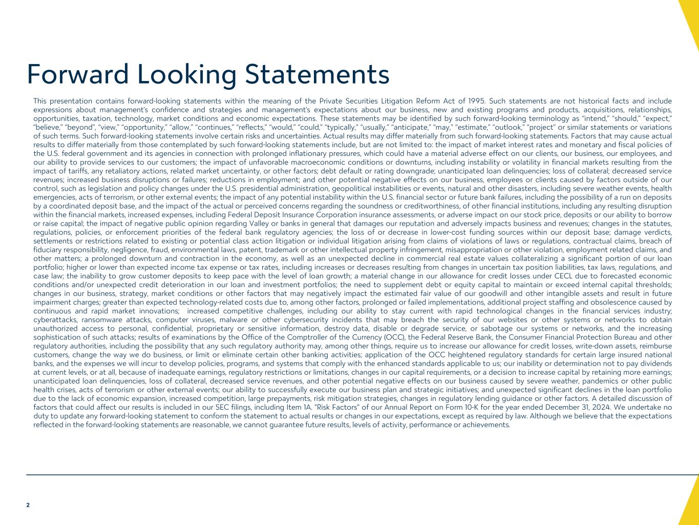 2 Forward Looking Statements This presentation contains forward-looking statements within the meaning of the Private Securities Litigation Reform Act of 1995. Such statements are not historical facts and include expressions about management’s confidence and strategies and management’s expectations about our business, new and existing programs and products, acquisitions, relationships, opportunities, taxation, technology, market conditions and economic expectations. These statements may be identified by such forward-looking terminology as “intend,” “should,” “expect,” “believe,” “beyond”, “view,” “opportunity,” “allow,” “continues,” “reflects,” “would,” “could,” “typically,” “usually,” “anticipate,” “may,” “estimate,” “outlook,” “project” or similar statements or variations of such terms. Such forward-looking statements involve certain risks and uncertainties. Actual results may differ materially from such forward-looking statements. Factors that may cause actual results to differ materially from those contemplated by such forward-looking statements include, but are not limited to: the impact of market interest rates and monetary and fiscal policies of the U.S. federal government and its agencies in connection with prolonged inflationary pressures, which could have a material adverse effect on our clients, our business, our employees, and our ability to provide services to our customers; the impact of unfavorable macroeconomic conditions or downturns, including instability or volatility in financial markets resulting from the impact of tariffs, any retaliatory actions, related market uncertainty, or other factors; debt default or rating downgrade; unanticipated loan delinquencies; loss of collateral; decreased service revenues; increased business disruptions or failures; reductions in employment; and other potential negative effects on our business, employees or clients caused by factors outside of our control, such as legislation and policy changes under the U.S. presidential administration, geopolitical instabilities or events, natural and other disasters, including severe weather events, health emergencies, acts of terrorism, or other external events; the impact of any potential instability within the U.S. financial sector or future bank failures, including the possibility of a run on deposits by a coordinated deposit base, and the impact of the actual or perceived concerns regarding the soundness or creditworthiness, of other financial institutions, including any resulting disruption within the financial markets, increased expenses, including Federal Deposit Insurance Corporation insurance assessments, or adverse impact on our stock price, deposits or our ability to borrow or raise capital; the impact of negative public opinion regarding Valley or banks in general that damages our reputation and adversely impacts business and revenues; changes in the statutes, regulations, policies, or enforcement priorities of the federal bank regulatory agencies; the loss of or decrease in lower-cost funding sources within our deposit base; damage verdicts, settlements or restrictions related to existing or potential class action litigation or individual litigation arising from claims of violations of laws or regulations, contractual claims, breach of fiduciary responsibility, negligence, fraud, environmental laws, patent, trademark or other intellectual property infringement, misappropriation or other violation, employment related claims, and other matters; a prolonged downturn and contraction in the economy, as well as an unexpected decline in commercial real estate values collateralizing a significant portion of our loan portfolio; higher or lower than expected income tax expense or tax rates, including increases or decreases resulting from changes in uncertain tax position liabilities, tax laws, regulations, and case law; the inability to grow customer deposits to keep pace with the level of loan growth; a material change in our allowance for credit losses under CECL due to forecasted economic conditions and/or unexpected credit deterioration in our loan and investment portfolios; the need to supplement debt or equity capital to maintain or exceed internal capital thresholds; changes in our business, strategy, market conditions or other factors that may negatively impact the estimated fair value of our goodwill and other intangible assets and result in future impairment charges; greater than expected technology-related costs due to, among other factors, prolonged or failed implementations, additional project staffing and obsolescence caused by continuous and rapid market innovations; increased competitive challenges, including our ability to stay current with rapid technological changes in the financial services industry; cyberattacks, ransomware attacks, computer viruses, malware or other cybersecurity incidents that may breach the security of our websites or other systems or networks to obtain unauthorized access to personal, confidential, proprietary or sensitive information, destroy data, disable or degrade service, or sabotage our systems or networks, and the increasing sophistication of such attacks; results of examinations by the Office of the Comptroller of the Currency (OCC), the Federal Reserve Bank, the Consumer Financial Protection Bureau and other regulatory authorities, including the possibility that any such regulatory authority may, among other things, require us to increase our allowance for credit losses, write-down assets, reimburse customers, change the way we do business, or limit or eliminate certain other banking activities; application of the OCC heightened regulatory standards for certain large insured national banks, and the expenses we will incur to develop policies, programs, and systems that comply with the enhanced standards applicable to us; our inability or determination not to pay div