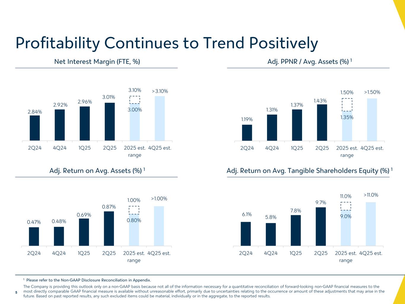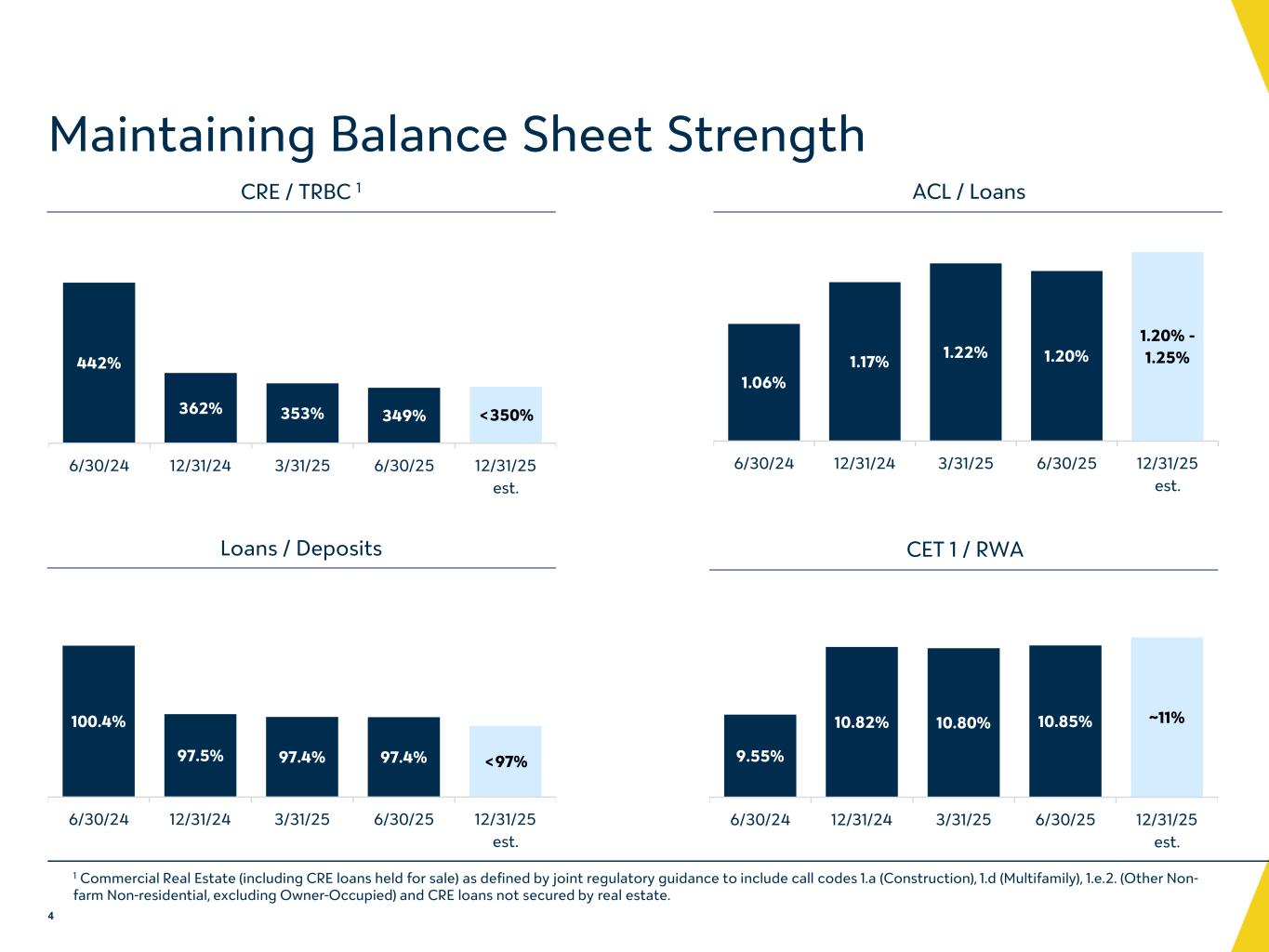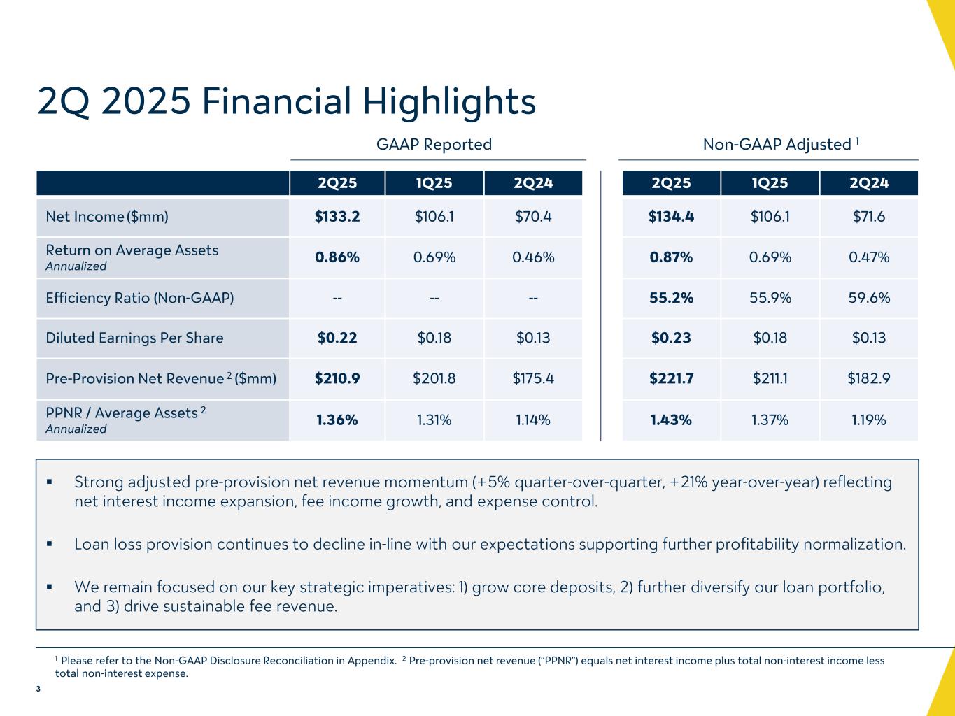 2Q 2025 Financial Highlights 2Q25 1Q25 2Q24 2Q25 1Q25 2Q24 Net Income ($mm) $133.2 $106.1 $70.4 $134.4 $106.1 $71.6 Return on Average Assets Annualized 0.86% 0.69% 0.46% 0.87% 0.69% 0.47% Efficiency Ratio (Non-GAAP) -- -- -- 55.2% 55.9% 59.6% Diluted Earnings Per Share $0.22 $0.18 $0.13 $0.23 $0.18 $0.13 Pre-Provision Net Revenue 2 ($mm) $210.9 $201.8 $175.4 $221.7 $211.1 $182.9 PPNR / Average Assets 2 Annualized 1.36% 1.31% 1.14% 1.43% 1.37% 1.19% GAAP Reported Non-GAAP Adjusted 1 1 Please refer to the Non-GAAP Disclosure Reconciliation in Appendix. 2 Pre-provision net revenue (“PPNR”) equals net interest income plus total non-interest income less total non-interest expense.  Strong adjusted pre-provision net revenue momentum (+5% quarter-over-quarter, +21% year-over-year) reflecting net interest income expansion, fee income growth, and expense control.  Loan loss provision continues to decline in-line with our expectations supporting further profitability normalization.  We remain focused on our key strategic imperatives: 1) grow core deposits, 2) further diversify our loan portfolio, and 3) drive sustainable fee revenue. 3