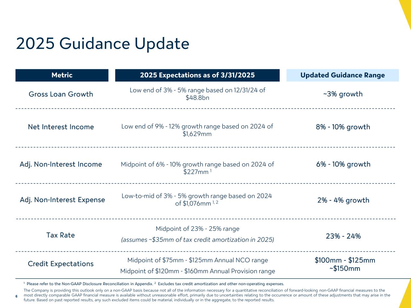 Profitability Continues to Trend Positively 5 Net Interest Margin (FTE, %) Adj. PPNR / Avg. Assets (%) 1 Adj. Return on Avg. Assets (%) 1 Adj. Return on Avg. Tangible Shareholders Equity (%) 1 2.84% 2.92% 2.96% 3.01% 3.00% >3.10%3.10% 2Q24 4Q24 1Q25 2Q25 2025 est. range 4Q25 est. 1.19% 1.31% 1.37% 1.43% 1.35% >1.50%1.50% 2Q24 4Q24 1Q25 2Q25 2025 est. range 4Q25 est. 0.47% 0.48% 0.69% 0.87% 0.80% >1.00%1.00% 2Q24 4Q24 1Q25 2Q25 2025 est. range 4Q25 est. 6.1% 5.8% 7.8% 9.7% 9.0% >11.0%11.0% 2Q24 4Q24 1Q25 2Q25 2025 est. range 4Q25 est. 1 Please refer to the Non-GAAP Disclosure Reconciliation in Appendix. The Company is providing this outlook only on a non-GAAP basis because not all of the information necessary for a quantitative reconciliation of forward-looking non-GAAP financial measures to the most directly comparable GAAP financial measure is available without unreasonable effort, primarily due to uncertainties relating to the occurrence or amount of these adjustments that may arise in the future. Based on past reported results, any such excluded items could be material, individually or in the aggregate, to the reported results.