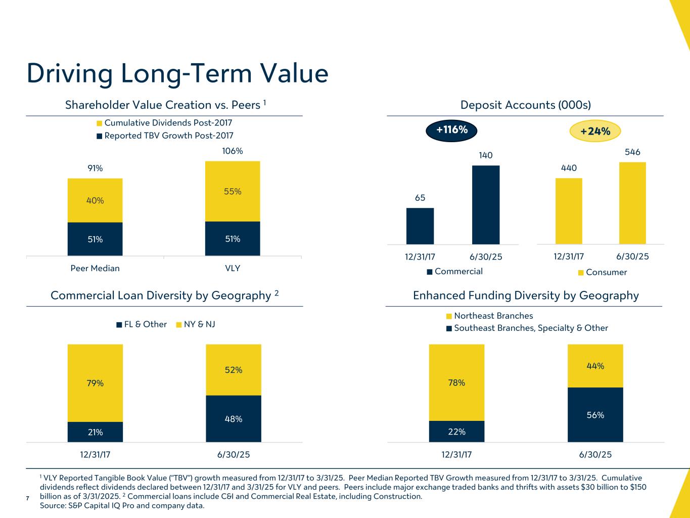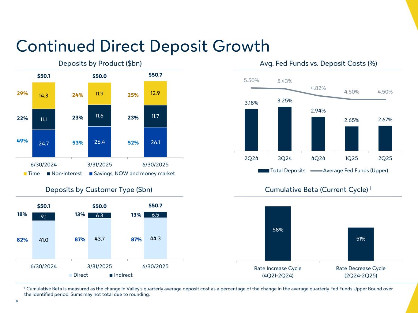 65 140 12/31/17 6/30/25 Commercial 51%51% 55% 40% 106% 91% VLYPeer Median Cumulative Dividends Post-2017 Reported TBV Growth Post-2017 +116% Shareholder Value Creation vs. Peers 1 Deposit Accounts (000s) Commercial Loan Diversity by Geography 2 Enhanced Funding Diversity by Geography 21% 48% 79% 52% 12/31/17 6/30/25 FL & Other NY & NJ 22% 56% 78% 44% 12/31/17 6/30/25 Northeast Branches Southeast Branches, Specialty & Other 440 546 12/31/17 6/30/25 Consumer +24% Driving Long-Term Value 1 VLY Reported Tangible Book Value (“TBV”) growth measured from 12/31/17 to 3/31/25. Peer Median Reported TBV Growth measured from 12/31/17 to 3/31/25. Cumulative dividends reflect dividends declared between 12/31/17 and 3/31/25 for VLY and peers. Peers include major exchange traded banks and thrifts with assets $30 billion to $150 billion as of 3/31/2025. 2 Commercial loans include C&I and Commercial Real Estate, including Construction. Source: S&P Capital IQ Pro and company data. 7