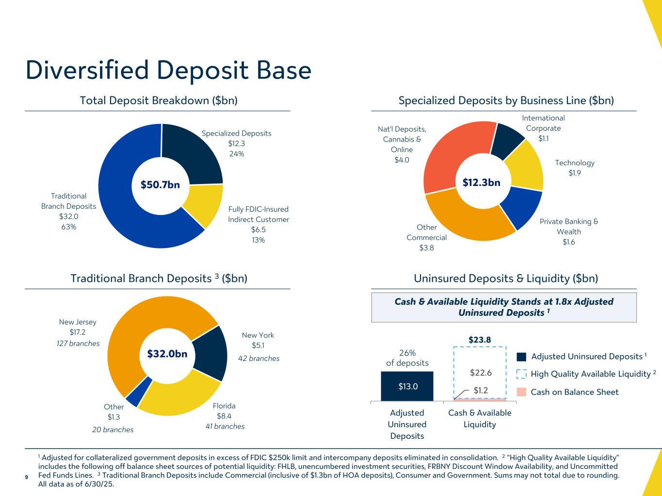 Continued Direct Deposit Growth 24.7 26.4 26.1 11.1 11.6 11.7 14.3 11.9 12.9 $50.1 $50.0 $50.7 6/30/2024 3/31/2025 6/30/2025 Time Non-Interest Savings, NOW and money market 25% 23% 52% 23% 49% 22% 29% 3.18% 3.25% 2.94% 2.65% 2.67% 5.50% 5.43% 4.82% 4.50% 4.50% 2Q24 3Q24 4Q24 1Q25 2Q25 Total Deposits Average Fed Funds (Upper) Deposits by Product ($bn) 24% 53% Avg. Fed Funds vs. Deposit Costs (%) Cumulative Beta (Current Cycle) 1Deposits by Customer Type ($bn) 82% 87% 13%18% 1 Cumulative Beta is measured as the change in Valley’s quarterly average deposit cost as a percentage of the change in the average quarterly Fed Funds Upper Bound over the identified period. Sums may not total due to rounding. 8 58% 51% Rate Increase Cycle (4Q21-2Q24) Rate Decrease Cycle (2Q24-2Q25) 41.0 43.7 44.3 9.1 6.3 6.5 $50.1 $50.0 $50.7 6/30/2024 3/31/2025 6/30/2025 Direct Indirect 87% 13%