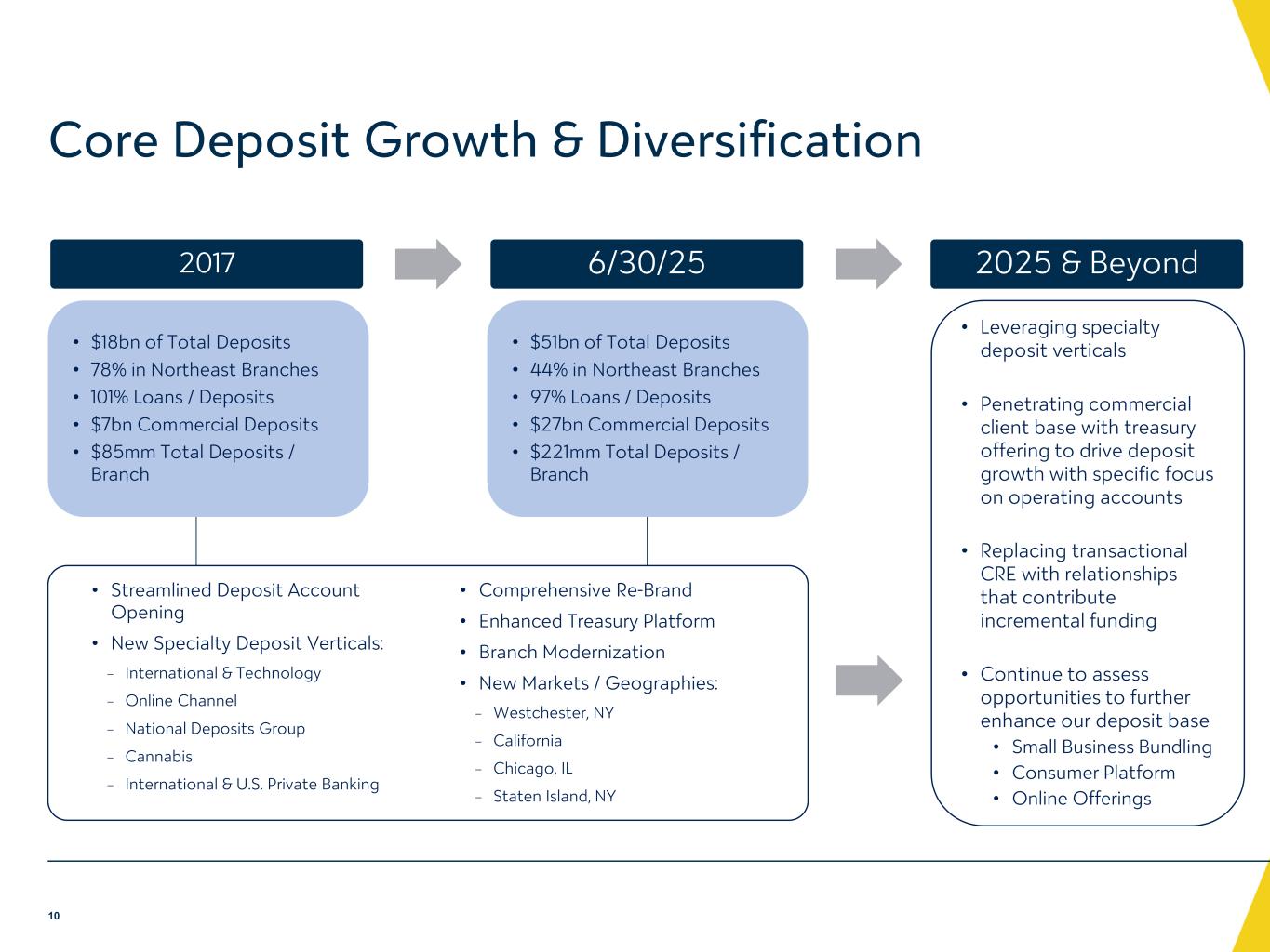 Traditional Branch Deposits $32.0 63% Specialized Deposits $12.3 24% Fully FDIC-Insured Indirect Customer $6.5 13% $50.7bn New Jersey $17.2 New York $5.1 Florida $8.4 Other $1.3 $32.0bn Total Deposit Breakdown ($bn) Traditional Branch Deposits 3 ($bn) Uninsured Deposits & Liquidity ($bn) $13.0 $1.2 $22.6 $23.8 Adjusted Uninsured Deposits Cash & Available Liquidity Cash on Balance Sheet High Quality Available Liquidity 2 Cash & Available Liquidity Stands at 1.8x Adjusted Uninsured Deposits 1 127 branches 20 branches 41 branches 42 branches Adjusted Uninsured Deposits 126% of deposits Nat'l Deposits, Cannabis & Online $4.0 International Corporate $1.1 Technology $1.9 Private Banking & Wealth $1.6 Other Commercial $3.8 $12.3bn Specialized Deposits by Business Line ($bn) 1 Adjusted for collateralized government deposits in excess of FDIC $250k limit and intercompany deposits eliminated in consolidation. 2 “High Quality Available Liquidity” includes the following off balance sheet sources of potential liquidity: FHLB, unencumbered investment securities, FRBNY Discount Window Availability, and Uncommitted Fed Funds Lines. 3 Traditional Branch Deposits include Commercial (inclusive of $1.3bn of HOA deposits), Consumer and Government. Sums may not total due to rounding. All data as of 6/30/25. 9 Diversified Deposit Base