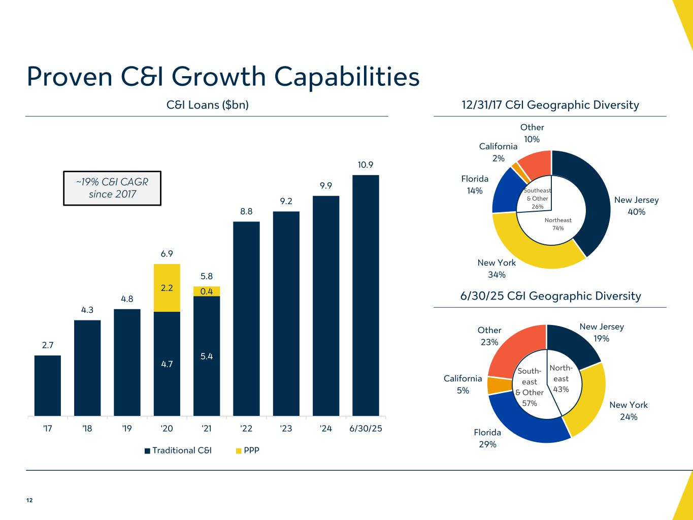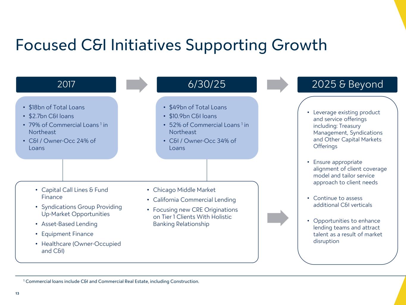 Proven C&I Growth Capabilities 4.7 5.4 2.2 0.4 2.7 4.3 4.8 6.9 5.8 8.8 9.2 9.9 10.9 '17 '18 '19 '20 '21 '22 '23 '24 6/30/25 Traditional C&I PPP ~19% C&I CAGR since 2017 New Jersey 19% New York 24% Florida 29% California 5% Other 23% North- east 43% South- east & Other 57% New Jersey 40% New York 34% Florida 14% California 2% Other 10% Northeast 74% Southeast & Other 26% 12 12/31/17 C&I Geographic Diversity 6/30/25 C&I Geographic Diversity C&I Loans ($bn)