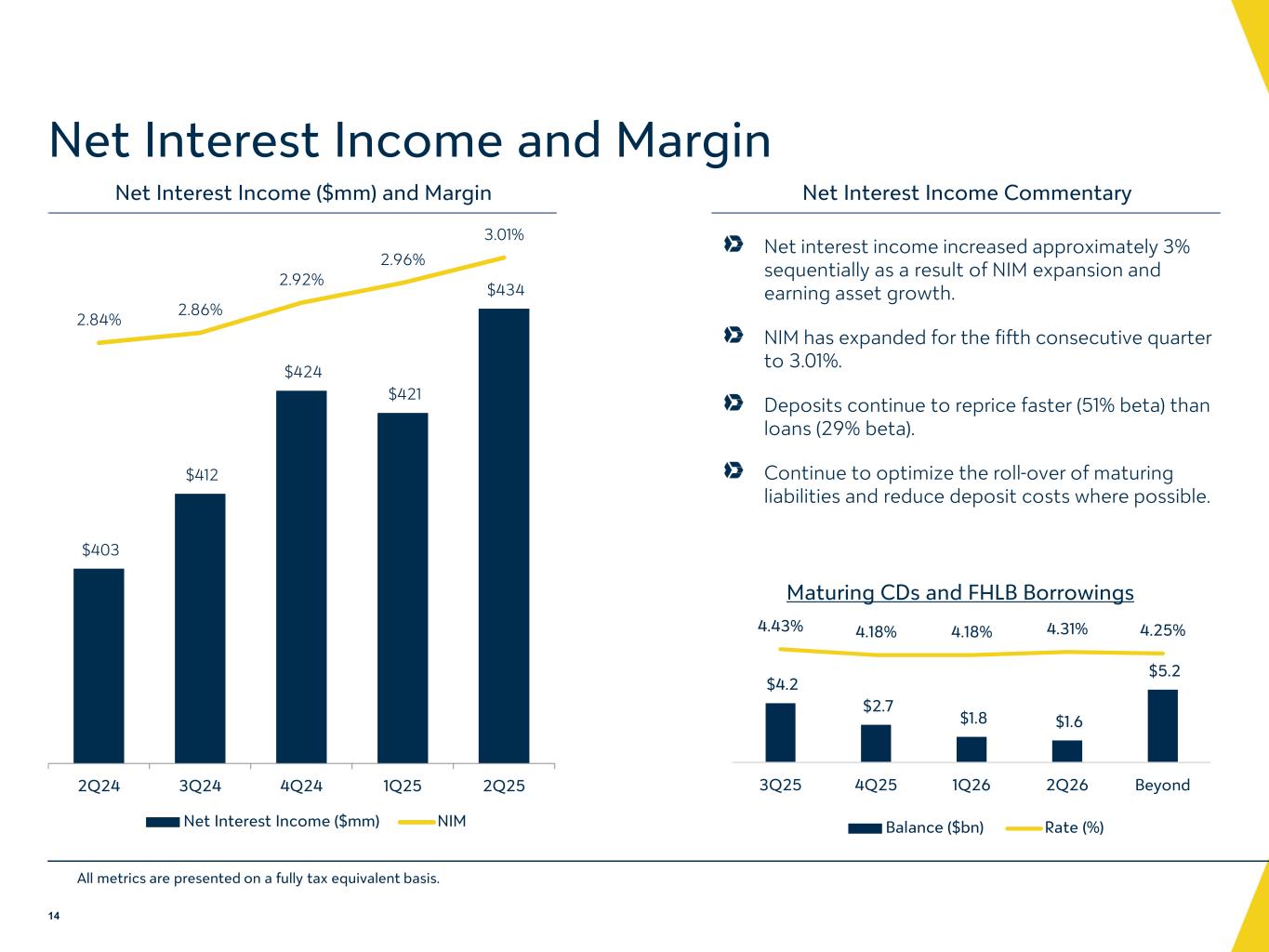 • $18bn of Total Loans • $2.7bn C&I loans • 79% of Commercial Loans 1 in Northeast • C&I / Owner-Occ 24% of Loans • $49bn of Total Loans • $10.9bn C&I loans • 52% of Commercial Loans 1 in Northeast • C&I / Owner-Occ 34% of Loans Focused C&I Initiatives Supporting Growth • Capital Call Lines & Fund Finance • Syndications Group Providing Up-Market Opportunities • Asset-Based Lending • Equipment Finance • Healthcare (Owner-Occupied and C&I) • Chicago Middle Market • California Commercial Lending • Focusing new CRE Originations on Tier 1 Clients With Holistic Banking Relationship 2017 6/30/25 2025 & Beyond • Leverage existing product and service offerings including: Treasury Management, Syndications and Other Capital Markets Offerings • Ensure appropriate alignment of client coverage model and tailor service approach to client needs • Continue to assess additional C&I verticals • Opportunities to enhance lending teams and attract talent as a result of market disruption 13 1 Commercial loans include C&I and Commercial Real Estate, including Construction.