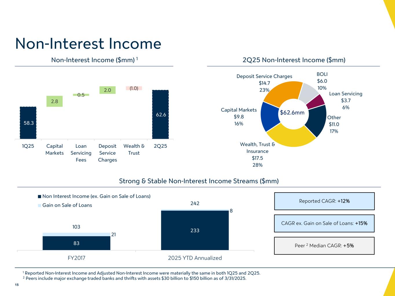 Net Interest Income ($mm) and Margin $403 $412 $424 $421 $434 2.84% 2.86% 2.92% 2.96% 3.01% 2Q24 3Q24 4Q24 1Q25 2Q25 Net Interest Income ($mm) NIM Net interest income increased approximately 3% sequentially as a result of NIM expansion and earning asset growth. NIM has expanded for the fifth consecutive quarter to 3.01%. Deposits continue to reprice faster (51% beta) than loans (29% beta). Continue to optimize the roll-over of maturing liabilities and reduce deposit costs where possible. Net Interest Income Commentary $4.2 $2.7 $1.8 $1.6 $5.2 4.43% 4.18% 4.18% 4.31% 4.25% 3Q25 4Q25 1Q26 2Q26 Beyond Maturing CDs and FHLB Borrowings Balance ($bn) Rate (%) Net Interest Income and Margin All metrics are presented on a fully tax equivalent basis. 14