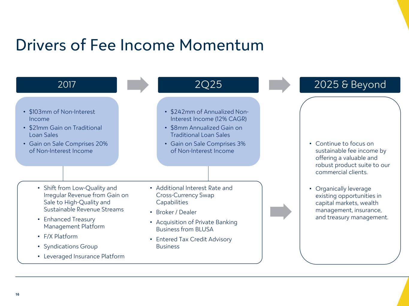 Other $11.0 17% Wealth, Trust & Insurance $17.5 28% Capital Markets $9.8 16% Deposit Service Charges $14.7 23% BOLI $6.0 10% Loan Servicing $3.7 6% $62.6mm Non-Interest Income 15 Strong & Stable Non-Interest Income Streams ($mm) 58.3 62.6 2.8 0.5 2.0 (1.0) 59.1 1Q25 Capital Markets Loan Servicing Fees Deposit Service Charges Wealth & Trust 2Q25 2Q25 Non-Interest Income ($mm) 83 233 21 8 103 242 FY2017 2025 YTD Annualized Non Interest Income (ex. Gain on Sale of Loans) Gain on Sale of Loans CAGR ex. Gain on Sale of Loans: +15% 1 Reported Non-Interest Income and Adjusted Non-Interest Income were materially the same in both 1Q25 and 2Q25. 2 Peers include major exchange traded banks and thrifts with assets $30 billion to $150 billion as of 3/31/2025. Reported CAGR: +12% Peer 2 Median CAGR: +5% Non-Interest Income ($mm) 1