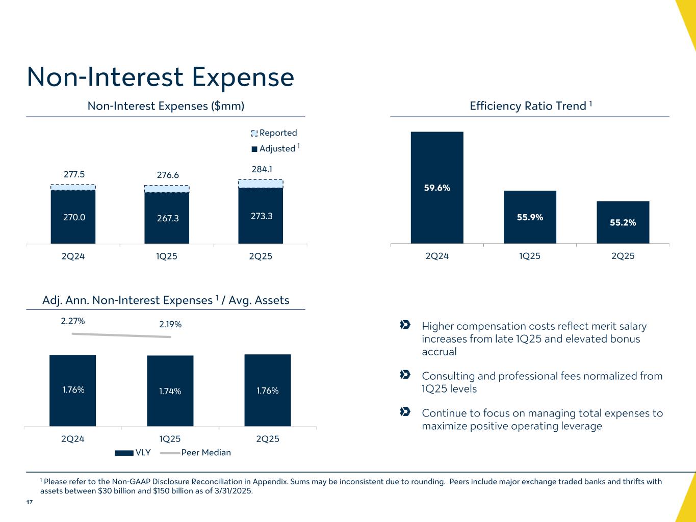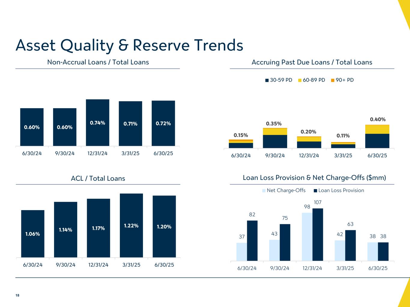 270.0 267.3 273.3 277.5 276.6 284.1 2Q24 1Q25 2Q25 Reported Adjusted Non-Interest Expenses ($mm) Efficiency Ratio Trend 1 59.6% 55.9% 55.2% 2Q24 1Q25 2Q25 1.76% 1.74% 1.76% 2.27% 2.19% 2Q24 1Q25 2Q25 VLY Peer Median Adj. Ann. Non-Interest Expenses 1 / Avg. Assets Higher compensation costs reflect merit salary increases from late 1Q25 and elevated bonus accrual Consulting and professional fees normalized from 1Q25 levels Continue to focus on managing total expenses to maximize positive operating leverage Non-Interest Expense 1 Please refer to the Non-GAAP Disclosure Reconciliation in Appendix. Sums may be inconsistent due to rounding. Peers include major exchange traded banks and thrifts with assets between $30 billion and $150 billion as of 3/31/2025. 17 1
