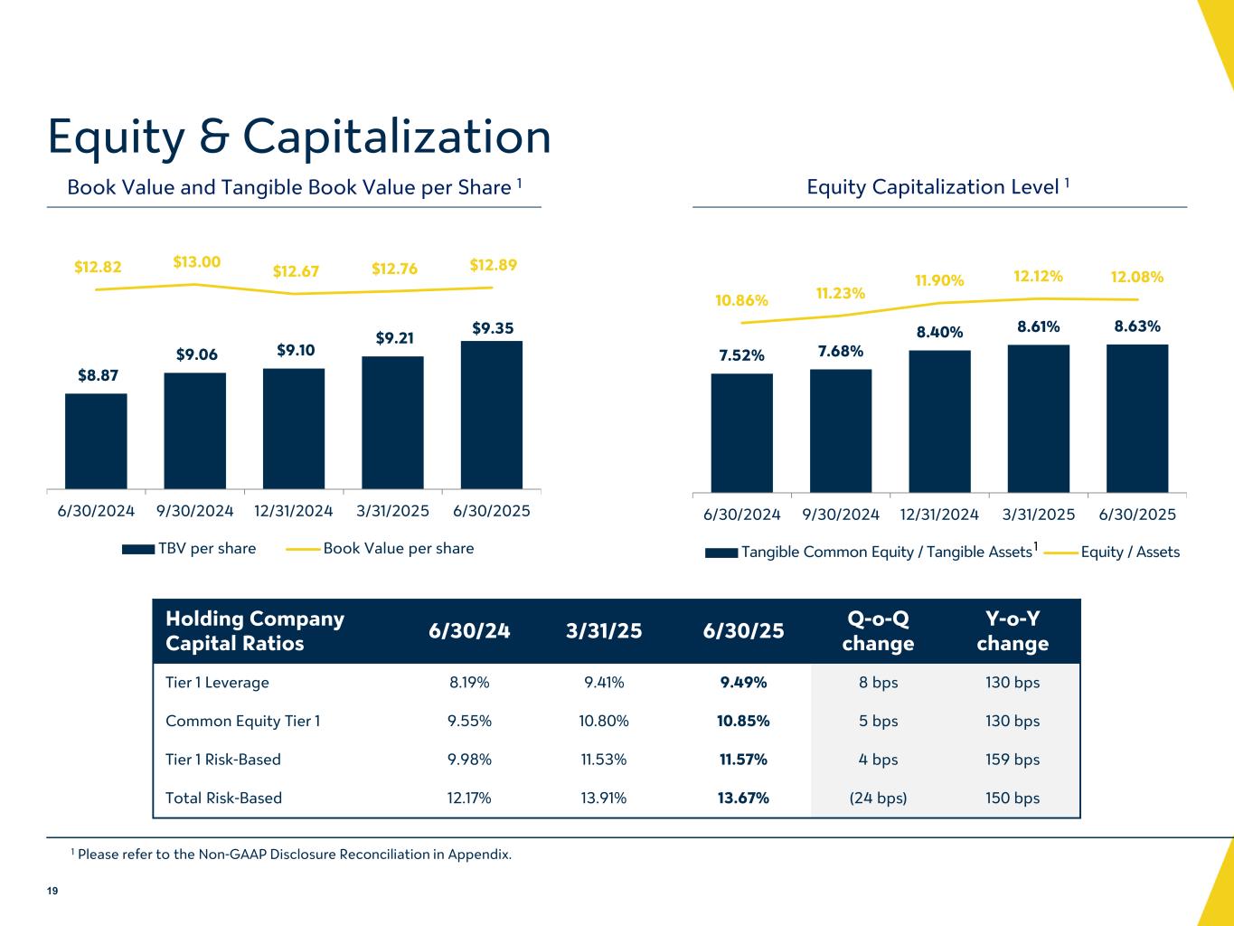 Non-Accrual Loans / Total Loans 0.99 % 1.03 % Accruing Past Due Loans / Total Loans Asset Quality & Reserve Trends 18 ACL / Total Loans 0.60% 0.60% 0.74% 0.71% 0.72% 6/30/24 9/30/24 12/31/24 3/31/25 6/30/25 0.15% 0.35% 0.20% 0.11% 0.40% 6/30/24 9/30/24 12/31/24 3/31/25 6/30/25 30-59 PD 60-89 PD 90+ PD 1.06% 1.14% 1.17% 1.22% 1.20% 6/30/24 9/30/24 12/31/24 3/31/25 6/30/25 37 43 98 42 38 82 75 107 63 38 6/30/24 9/30/24 12/31/24 3/31/25 6/30/25 Net Charge-Offs Loan Loss Provision Loan Loss Provision & Net Charge-Offs ($mm)
