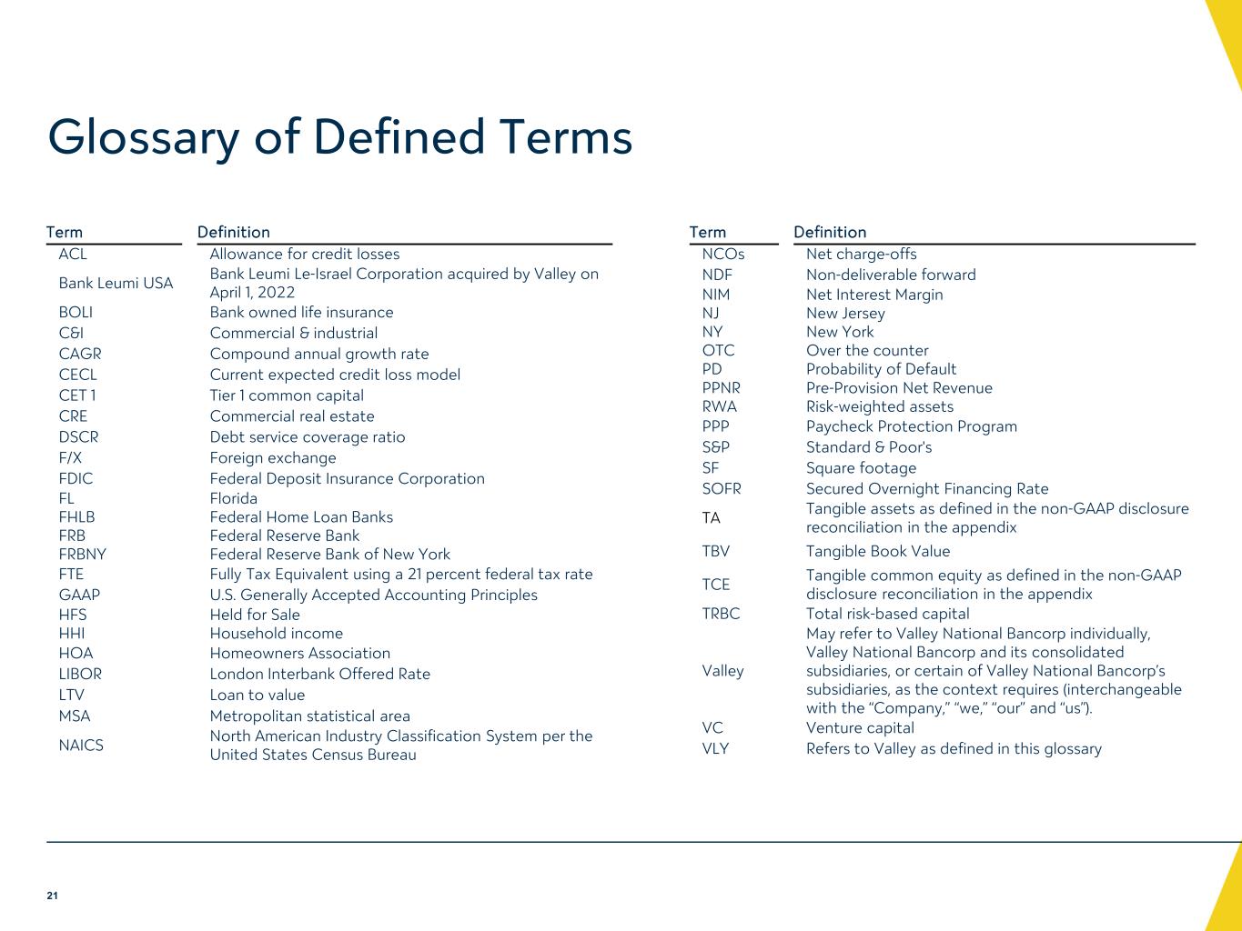 Term Definition ACL Allowance for credit losses Bank Leumi USA Bank Leumi Le-Israel Corporation acquired by Valley on April 1, 2022 BOLI Bank owned life insurance C&I Commercial & industrial CAGR Compound annual growth rate CECL Current expected credit loss model CET 1 Tier 1 common capital CRE Commercial real estate DSCR Debt service coverage ratio F/X Foreign exchange FDIC Federal Deposit Insurance Corporation FL FHLB FRB FRBNY Florida Federal Home Loan Banks Federal Reserve Bank Federal Reserve Bank of New York FTE Fully Tax Equivalent using a 21 percent federal tax rate GAAP U.S. Generally Accepted Accounting Principles HFS HHI Held for Sale Household income HOA Homeowners Association LIBOR London Interbank Offered Rate LTV Loan to value MSA Metropolitan statistical area NAICS North American Industry Classification System per the United States Census Bureau Term Definition NCOs Net charge-offs NDF Non-deliverable forward NIM NJ NY OTC PD Net Interest Margin New Jersey New York Over the counter Probability of Default PPNR RWA Pre-Provision Net Revenue Risk-weighted assets PPP Paycheck Protection Program S&P Standard & Poor's SF Square footage SOFR Secured Overnight Financing Rate TA Tangible assets as defined in the non-GAAP disclosure reconciliation in the appendix TBV Tangible Book Value TCE Tangible common equity as defined in the non-GAAP disclosure reconciliation in the appendix TRBC Total risk-based capital Valley May refer to Valley National Bancorp individually, Valley National Bancorp and its consolidated subsidiaries, or certain of Valley National Bancorp’s subsidiaries, as the context requires (interchangeable with the “Company,” “we,” “our” and “us”). VC Venture capital VLY Refers to Valley as defined in this glossary Glossary of Defined Terms 21