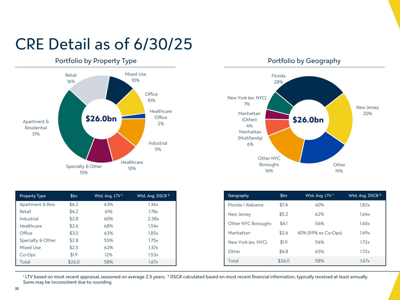 Apartment & Residential 31% Retail 16% Mixed Use 10% Office 10% Healthcare Office 2% Industrial 11% Healthcare 10%Specialty & Other 10% CRE Detail as of 6/30/25 Portfolio by Property Type Portfolio by Geography Florida 28% New Jersey 20% Other 19% Other NYC Boroughs 16% Manhattan (Multifamily) 6% Manhattan (Other) 4% New York (ex. NYC) 7% Geography $bn Wtd. Avg. LTV 1 Wtd. Avg. DSCR 2 Florida / Alabama $7.4 60% 1.82x New Jersey $5.2 62% 1.64x Other NYC Boroughs $4.1 56% 1.45x Manhattan $2.6 40% (59% ex Co-Ops) 1.49x New York (ex. NYC) $1.9 54% 1.72x Other $4.8 65% 1.72x Total $26.0 58% 1.67x $26.0bn $26.0bn 1 LTV based on most recent appraisal, seasoned on average 2.5 years; 2 DSCR calculated based on most recent financial information, typically received at least annually. Sums may be inconsistent due to rounding. 22 Property Type $bn Wtd. Avg. LTV 1 Wtd. Avg. DSCR 2 Apartment & Resi $6.2 63% 1.36x Retail $4.2 61% 1.78x Industrial $2.8 60% 2.38x Healthcare $2.6 68% 1.54x Office $3.0 63% 1.85x Specialty & Other $2.8 55% 1.75x Mixed Use $2.5 62% 1.37x Co-Ops $1.9 12% 1.53x Total $26.0 58% 1.67x