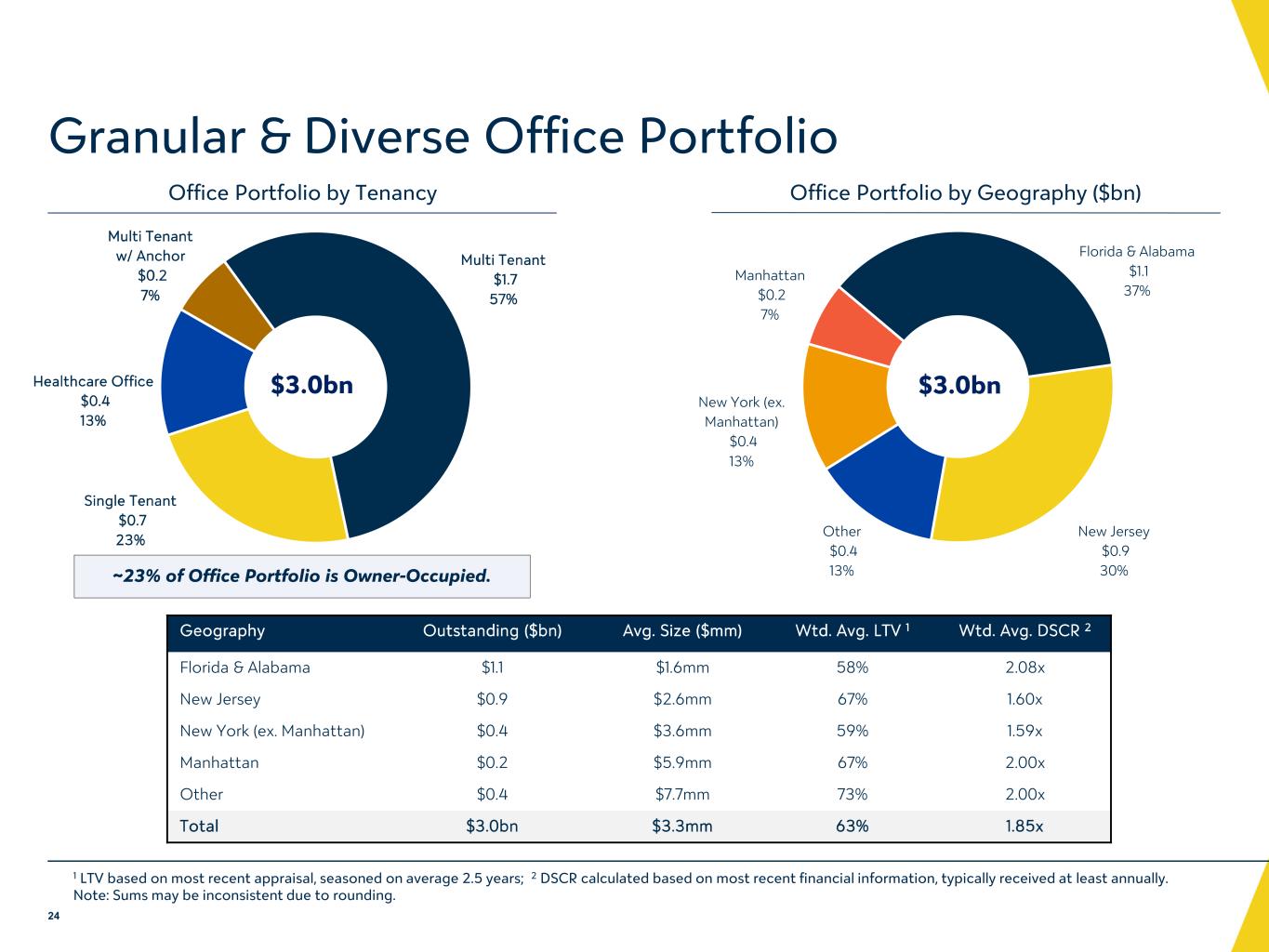 0% of units 42% 1% - 20% of units 4% 21% - 50% of units 29% 51% - 99% of units 8% 100% of units 17% Co-Op $1.9 Non Co-Op $6.2 Multifamily Portfolio by Sub-Asset Class ($bn) Non Co-Op Multifamily by Geography ($bn) $8.1bn Geography Outstanding ($bn) Avg. Size ($mm) Wtd. Avg. LTV 1 Wtd. Avg. DSCR 2 New York (ex. Manhattan) $1.7 $6.2mm 68% 1.27x Other $1.6 $9.6mm 63% 1.30x New Jersey $1.2 $3.4mm 60% 1.57x Florida & Alabama $1.1 $3.8mm 60% 1.41x Manhattan $0.6 $7.3mm 62% 1.31x Total $6.2bn $6.2mm 63% 1.36x Florida & Alabama 18% New Jersey 19% Other 26% New York (ex. Manhattan) 27% Manhattan 10% $6.2bn New York City by % Rent Regulated Units $2.4bn Multifamily Portfolio Detail 1 LTV based on most recent appraisal, seasoned on average 2.5 years; 2 DSCR calculated based on most recent financial information, typically received at least annually. Note: Co-Op LTV is approximately 12%. Sums may be inconsistent due to rounding. 23