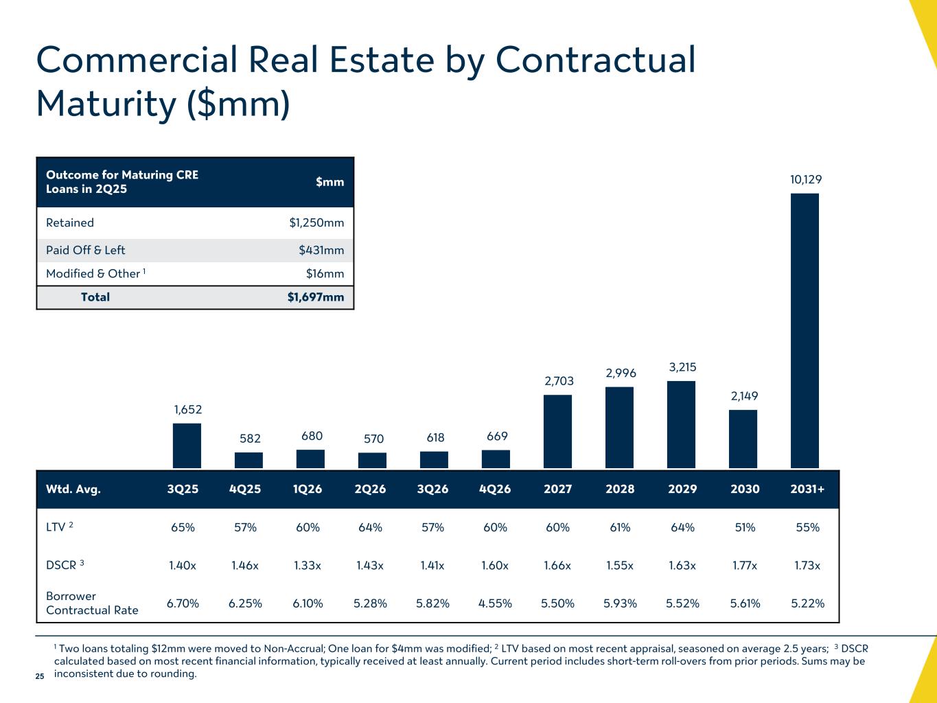 Commercial Real Estate by Contractual Maturity ($mm) 1,652 582 680 570 618 669 2,703 2,996 3,215 2,149 10,129 3Q25 4Q25 1Q26 2Q26 3Q26 4Q26 2027 2028 2029 2030 2031 and Beyond Wtd. Avg. 3Q25 4Q25 1Q26 2Q26 3Q26 4Q26 2027 2028 2029 2030 2031+ LTV 2 65% 57% 60% 64% 57% 60% 60% 61% 64% 51% 55% DSCR 3 1.40x 1.46x 1.33x 1.43x 1.41x 1.60x 1.66x 1.55x 1.63x 1.77x 1.73x Borrower Contractual Rate 6.70% 6.25% 6.10% 5.28% 5.82% 4.55% 5.50% 5.93% 5.52% 5.61% 5.22% 1 Two loans totaling $12mm were moved to Non-Accrual; One loan for $4mm was modified; 2 LTV based on most recent appraisal, seasoned on average 2.5 years; 3 DSCR calculated based on most recent financial information, typically received at least annually. Current period includes short-term roll-overs from prior periods. Sums may be inconsistent due to rounding.25 Outcome for Maturing CRE Loans in 2Q25 $mm Retained $1,250mm Paid Off & Left $431mm Modified & Other 1 $16mm Total $1,697mm