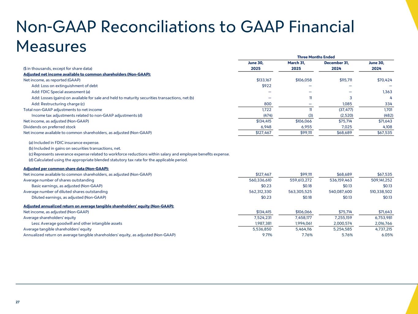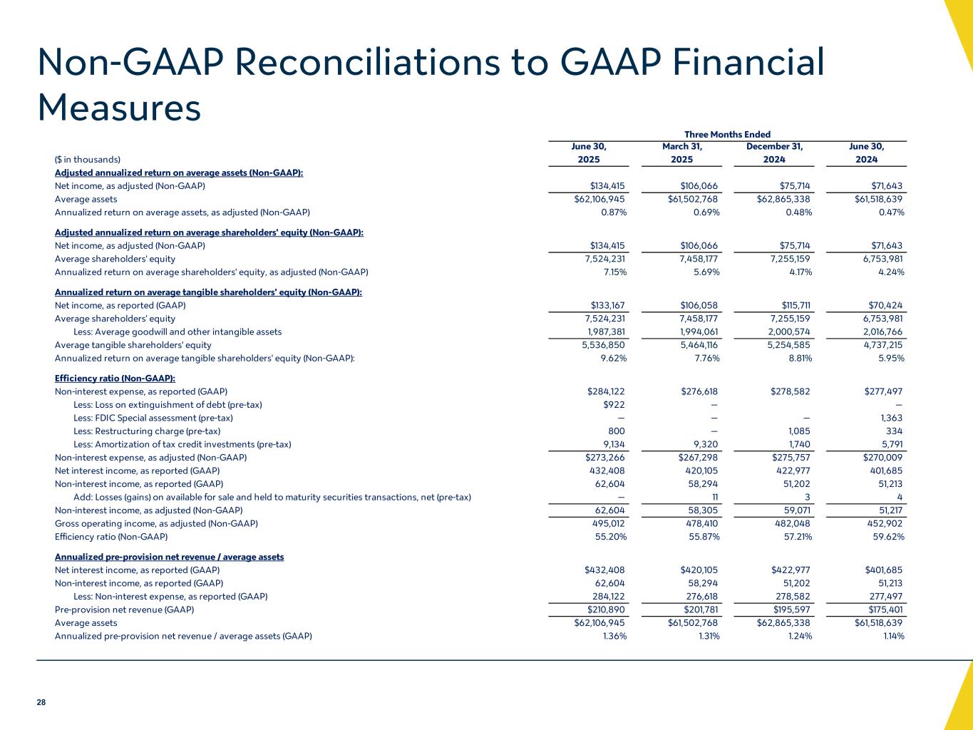 Non-GAAP Reconciliations to GAAP Financial Measures 27 June 30, March 31, December 31, June 30, ($ in thousands, except for share data) 2025 2025 2024 2024 Adjusted net income available to common shareholders (Non-GAAP): Net income, as reported (GAAP) $133,167 $106,058 $115,711 $70,424 Add: Loss on extinguishment of debt $922 — — — Add: FDIC Special assessment (a) — — — 1,363 Add: Losses (gains) on available for sale and held to maturity securities transactions, net (b) — 11 3 4 Add: Restructuring charge (c) 800 — 1,085 334 Total non-GAAP adjustments to net income 1,722 11 (37,477) 1,701 Income tax adjustments related to non-GAAP adjustments (d) (474) (3) (2,520) (482) Net income, as adjusted (Non-GAAP) $134,415 $106,066 $75,714 $71,643 Dividends on preferred stock 6,948 6,955 7,025 4,108 Net income available to common shareholders, as adjusted (Non-GAAP) $127,467 $99,111 $68,689 $67,535 (a) Included in FDIC insurance expense. (b) Included in gains on securities transactions, net. (c) Represents severance expense related to workforce reductions within salary and employee benefits expense. (d) Calculated using the appropriate blended statutory tax rate for the applicable period. Adjusted per common share data (Non-GAAP): Net income available to common shareholders, as adjusted (Non-GAAP) $127,467 $99,111 $68,689 $67,535 Average number of shares outstanding 560,336,610 559,613,272 536,159,463 509,141,252 Basic earnings, as adjusted (Non-GAAP) $0.23 $0.18 $0.13 $0.13 Average number of diluted shares outstanding 562,312,330 563,305,525 540,087,600 510,338,502 Diluted earnings, as adjusted (Non-GAAP) $0.23 $0.18 $0.13 $0.13 Adjusted annualized return on average tangible shareholders' equity (Non-GAAP): Net income, as adjusted (Non-GAAP) $134,415 $106,066 $75,714 $71,643 Average shareholders' equity 7,524,231 7,458,177 7,255,159 6,753,981 Less: Average goodwill and other intangible assets 1,987,381 1,994,061 2,000,574 2,016,766 Average tangible shareholders' equity 5,536,850 5,464,116 5,254,585 4,737,215 Annualized return on average tangible shareholders' equity, as adjusted (Non-GAAP) 9.71% 7.76% 5.76% 6.05% Three Months Ended