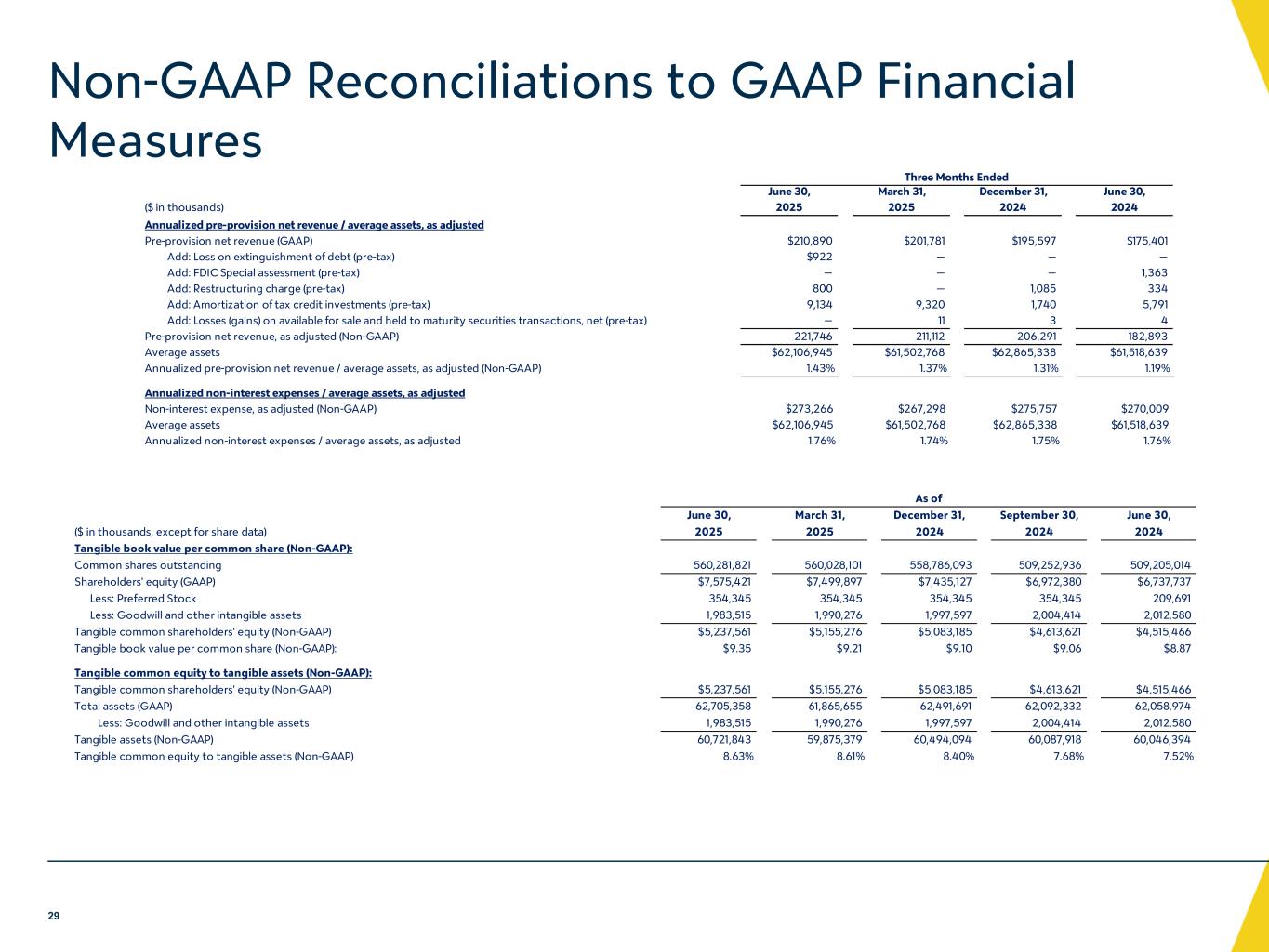 Non-GAAP Reconciliations to GAAP Financial Measures 28 June 30, March 31, December 31, June 30, ($ in thousands) 2025 2025 2024 2024 Adjusted annualized return on average assets (Non-GAAP): Net income, as adjusted (Non-GAAP) $134,415 $106,066 $75,714 $71,643 Average assets $62,106,945 $61,502,768 $62,865,338 $61,518,639 Annualized return on average assets, as adjusted (Non-GAAP) 0.87% 0.69% 0.48% 0.47% Adjusted annualized return on average shareholders' equity (Non-GAAP): Net income, as adjusted (Non-GAAP) $134,415 $106,066 $75,714 $71,643 Average shareholders' equity 7,524,231 7,458,177 7,255,159 6,753,981 Annualized return on average shareholders' equity, as adjusted (Non-GAAP) 7.15% 5.69% 4.17% 4.24% Annualized return on average tangible shareholders' equity (Non-GAAP): Net income, as reported (GAAP) $133,167 $106,058 $115,711 $70,424 Average shareholders' equity 7,524,231 7,458,177 7,255,159 6,753,981 Less: Average goodwill and other intangible assets 1,987,381 1,994,061 2,000,574 2,016,766 Average tangible shareholders' equity 5,536,850 5,464,116 5,254,585 4,737,215 Annualized return on average tangible shareholders' equity (Non-GAAP): 9.62% 7.76% 8.81% 5.95% Efficiency ratio (Non-GAAP): Non-interest expense, as reported (GAAP) $284,122 $276,618 $278,582 $277,497 Less: Loss on extinguishment of debt (pre-tax) $922 — — Less: FDIC Special assessment (pre-tax) — — — 1,363 Less: Restructuring charge (pre-tax) 800 — 1,085 334 Less: Amortization of tax credit investments (pre-tax) 9,134 9,320 1,740 5,791 Non-interest expense, as adjusted (Non-GAAP) $273,266 $267,298 $275,757 $270,009 Net interest income, as reported (GAAP) 432,408 420,105 422,977 401,685 Non-interest income, as reported (GAAP) 62,604 58,294 51,202 51,213 Add: Losses (gains) on available for sale and held to maturity securities transactions, net (pre-tax) — 11 3 4 Non-interest income, as adjusted (Non-GAAP) 62,604 58,305 59,071 51,217 Gross operating income, as adjusted (Non-GAAP) 495,012 478,410 482,048 452,902 Efficiency ratio (Non-GAAP) 55.20% 55.87% 57.21% 59.62% Annualized pre-provision net revenue / average assets Net interest income, as reported (GAAP) $432,408 $420,105 $422,977 $401,685 Non-interest income, as reported (GAAP) 62,604 58,294 51,202 51,213 Less: Non-interest expense, as reported (GAAP) 284,122 276,618 278,582 277,497 Pre-provision net revenue (GAAP) $210,890 $201,781 $195,597 $175,401 Average assets $62,106,945 $61,502,768 $62,865,338 $61,518,639 Annualized pre-provision net revenue / average assets (GAAP) 1.36% 1.31% 1.24% 1.14% Three Months Ended