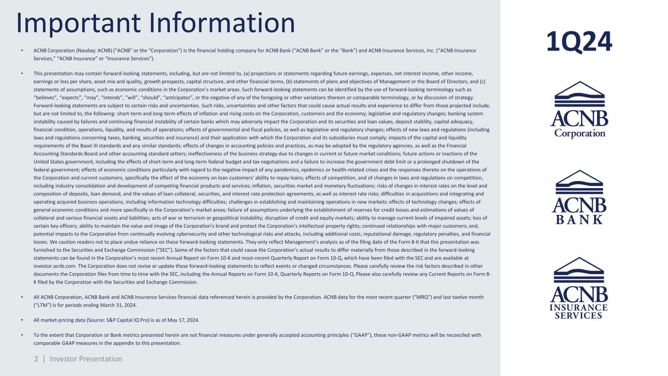 A C N B C O R P O R A T I O N Investor Presentation First Quarter of 2024 Nasdaq: ACNB investor.acnb.com