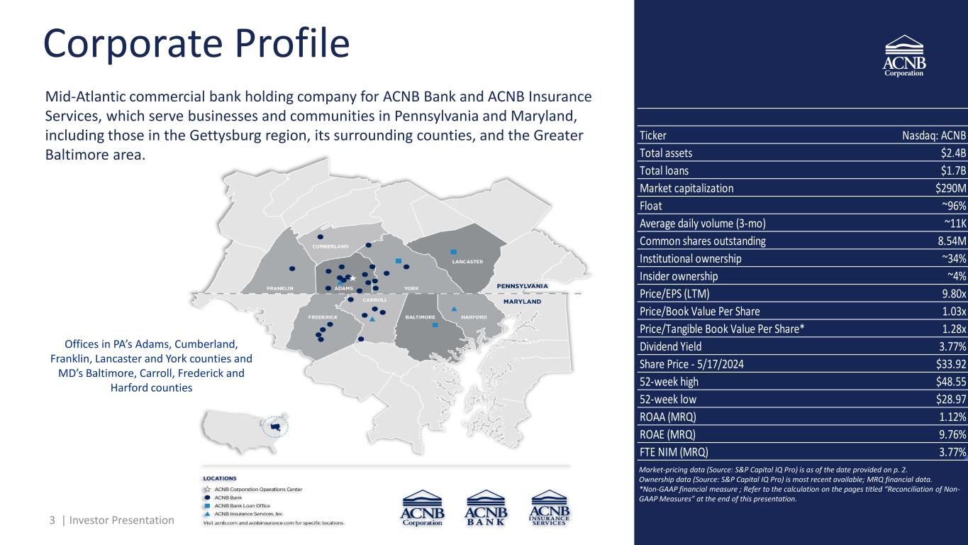 2 | Investor Presentation Important Information • ACNB Corporation (Nasdaq: ACNB) (“ACNB” or the “Corporation”) is the financial holding company for ACNB Bank (“ACNB Bank” or the “Bank”) and ACNB Insurance Services, Inc. (“ACNB Insurance Services,” “ACNB Insurance” or “Insurance Services”). • This presentation may contain forward-looking statements, including, but are not limited to, (a) projections or statements regarding future earnings, expenses, net interest income, other income, earnings or loss per share, asset mix and quality, growth prospects, capital structure, and other financial terms, (b) statements of plans and objectives of Management or the Board of Directors, and (c) statements of assumptions, such as economic conditions in the Corporation’s market areas. Such forward-looking statements can be identified by the use of forward-looking terminology such as “believes”, “expects”, “may”, “intends”, “will”, “should”, “anticipates”, or the negative of any of the foregoing or other variations thereon or comparable terminology, or by discussion of strategy. Forward-looking statements are subject to certain risks and uncertainties. Such risks, uncertainties and other factors that could cause actual results and experience to differ from those projected include, but are not limited to, the following: short-term and long-term effects of inflation and rising costs on the Corporation, customers and the economy; legislative and regulatory changes; banking system instability caused by failures and continuing financial instability of certain banks which may adversely impact the Corporation and its securities and loan values, deposit stability, capital adequacy, financial condition, operations, liquidity, and results of operations; effects of governmental and fiscal policies, as well as legislative and regulatory changes; effects of new laws and regulations (including laws and regulations concerning taxes, banking, securities and insurance) and their application with which the Corporation and its subsidiaries must comply; impacts of the capital and liquidity requirements of the Basel III standards and any similar standards; effects of changes in accounting policies and practices, as may be adopted by the regulatory agencies, as well as the Financial Accounting Standards Board and other accounting standard setters; ineffectiveness of the business strategy due to changes in current or future market conditions; future actions or inactions of the United States government, including the effects of short-term and long-term federal budget and tax negotiations and a failure to increase the government debt limit or a prolonged shutdown of the federal government; effects of economic conditions particularly with regard to the negative impact of any pandemics, epidemics or health-related crises and the responses thereto on the operations of the Corporation and current customers, specifically the effect of the economy on loan customers' ability to repay loans; effects of competition, and of changes in laws and regulations on competition, including industry consolidation and development of competing financial products and services; inflation, securities market and monetary fluctuations; risks of changes in interest rates on the level and composition of deposits, loan demand, and the values of loan collateral, securities, and interest rate protection agreements, as well as interest rate risks; difficulties in acquisitions and integrating and operating acquired business operations, including information technology difficulties; challenges in establishing and maintaining operations in new markets; effects of technology changes; effects of general economic conditions and more specifically in the Corporation's market areas; failure of assumptions underlying the establishment of reserves for credit losses and estimations of values of collateral and various financial assets and liabilities; acts of war or terrorism or geopolitical instability; disruption of credit and equity markets; ability to manage current levels of impaired assets; loss of certain key officers; ability to maintain the value and image of the Corporation's brand and protect the Corporation's intellectual property rights; continued relationships with major customers; and, potential impacts to the Corporation from continually evolving cybersecurity and other technological risks and attacks, including additional costs, reputational damage, regulatory penalties, and financial losses. We caution readers not to place undue reliance on these forward-looking statements. They only reflect Management’s analysis as of the filing date of the Form 8-K that this presentation was furnished to the Securities and Exchange Commission (“SEC”). Some of the factors that could cause the Corporation’s actual results to differ materially from those described in the forward-looking statements can be found in the Corporation’s most recent Annual Report on Form 10-K and most-recent Quarterly Report on Form 10-Q, which have been filed with the SEC and are available at investor.acnb.com. The Corporation does not revise or update these forward-looking statements to reflect events or changed circumstances. Please carefully review the risk factors described in other documents the Corporation files from time to time with the SEC, including the Annual Reports on Form 10-K, Quarterly Reports on Form 10-Q. Please also carefully review any Current Reports on Form 8- K filed by the Corporation with the Securities and Exchange Commission. • All ACNB Corporation, ACNB Bank and ACNB Insurance Services financial data referenced herein is provided by the Corporation. ACNB data for the most recent quarter (“MRQ”) and last twelve month (“LTM”) is for periods ending March 31, 2024. • All market-pricing data (Source: S&P Capital IQ Pro) is as of May 17, 2024. • To the extent that Corporation or Bank metr