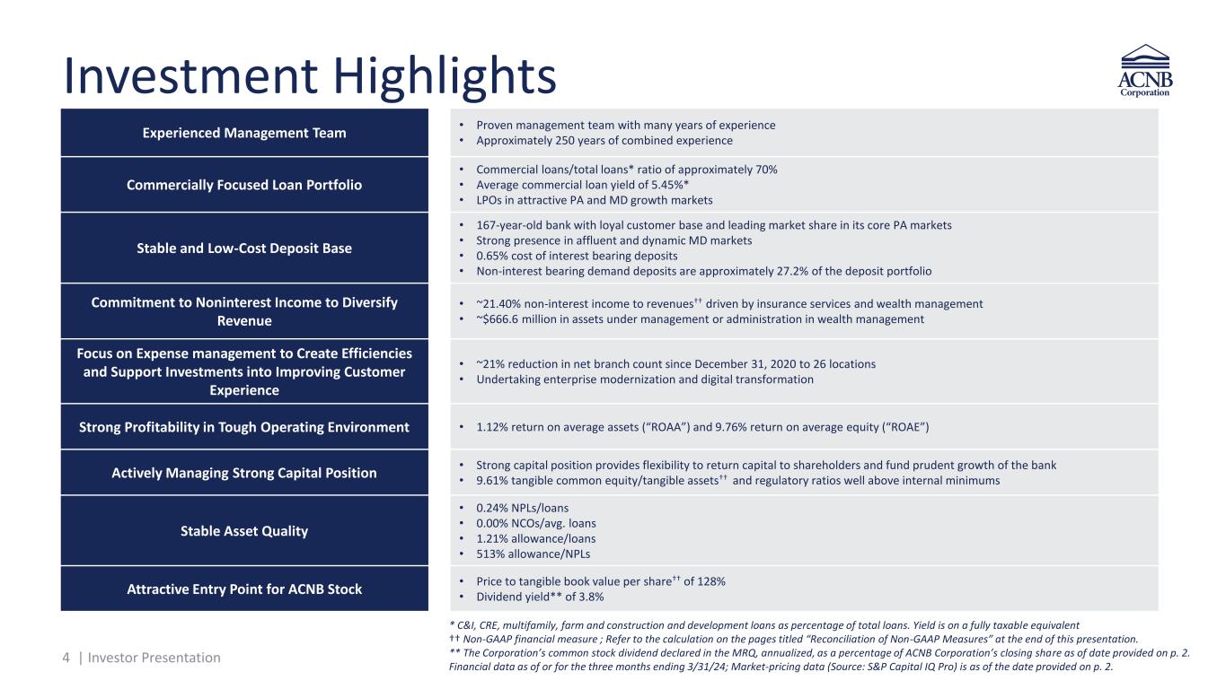 3 | Investor Presentation Corporate Profile Mid-Atlantic commercial bank holding company for ACNB Bank and ACNB Insurance Services, which serve businesses and communities in Pennsylvania and Maryland, including those in the Gettysburg region, its surrounding counties, and the Greater Baltimore area. Market-pricing data (Source: S&P Capital IQ Pro) is as of the date provided on p. 2. Ownership data (Source: S&P Capital IQ Pro) is most recent available; MRQ financial data. *Non-GAAP financial measure ; Refer to the calculation on the pages titled “Reconciliation of Non- GAAP Measures” at the end of this presentation. Offices in PA’s Adams, Cumberland, Franklin, Lancaster and York counties and MD’s Baltimore, Carroll, Frederick and Harford counties Ticker Nasdaq: ACNB Total assets $2.4B Total loans $1.7B Market capitalization $290M Float ~96% Average daily volume (3-mo) ~11K Common shares outstanding 8.54M Institutional ownership ~34% Insider ownership ~4% Price/EPS (LTM) 9.80x Price/Book Value Per Share 1.03x Price/Tangible Book Value Per Share* 1.28x Dividend Yield 3.77% Share Price - 5/17/2024 $33.92 52-week high $48.55 52-week low $28.97 ROAA (MRQ) 1.12% ROAE (MRQ) 9.76% FTE NIM (MRQ) 3.77%