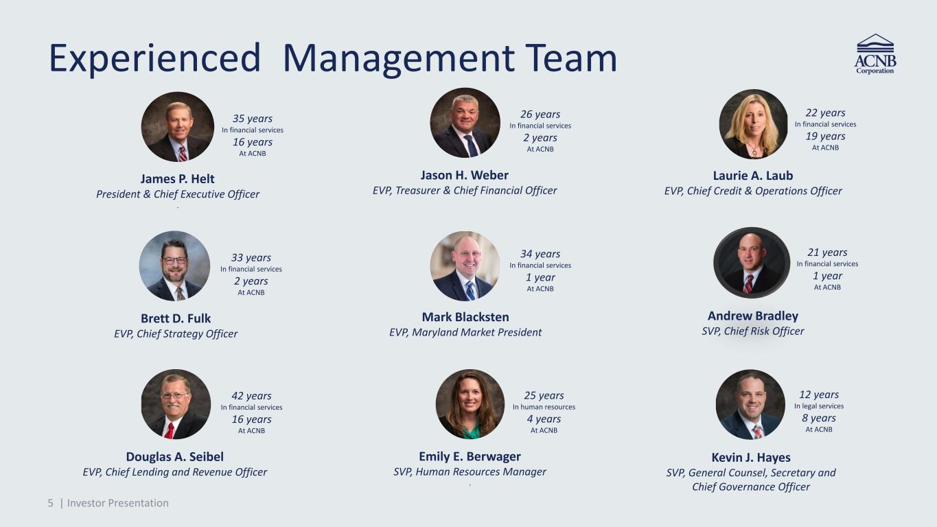 4 | Investor Presentation Experienced Management Team • Proven management team with many years of experience • Approximately 250 years of combined experience Commercially Focused Loan Portfolio • Commercial loans/total loans* ratio of approximately 70% • Average commercial loan yield of 5.45%* • LPOs in attractive PA and MD growth markets Stable and Low-Cost Deposit Base • 167-year-old bank with loyal customer base and leading market share in its core PA markets • Strong presence in affluent and dynamic MD markets • 0.65% cost of interest bearing deposits • Non-interest bearing demand deposits are approximately 27.2% of the deposit portfolio Commitment to Noninterest Income to Diversify Revenue • ~21.40% non-interest income to revenues†† driven by insurance services and wealth management • ~$666.6 million in assets under management or administration in wealth management Focus on Expense management to Create Efficiencies and Support Investments into Improving Customer Experience • ~21% reduction in net branch count since December 31, 2020 to 26 locations • Undertaking enterprise modernization and digital transformation Strong Profitability in Tough Operating Environment • 1.12% return on average assets (“ROAA”) and 9.76% return on average equity (“ROAE”) Actively Managing Strong Capital Position • Strong capital position provides flexibility to return capital to shareholders and fund prudent growth of the bank • 9.61% tangible common equity/tangible assets†† and regulatory ratios well above internal minimums Stable Asset Quality • 0.24% NPLs/loans • 0.00% NCOs/avg. loans • 1.21% allowance/loans • 513% allowance/NPLs Attractive Entry Point for ACNB Stock • Price to tangible book value per share†† of 128% • Dividend yield** of 3.8% Investment Highlights * C&I, CRE, multifamily, farm and construction and development loans as percentage of total loans. Yield is on a fully taxable equivalent †† Non-GAAP financial measure ; Refer to the calculation on the pages titled “Reconciliation of Non-GAAP Measures” at the end of this presentation. ** The Corporation’s common stock dividend declared in the MRQ, annualized, as a percentage of ACNB Corporation’s closing share as of date provided on p. 2. Financial data as of or for the three months ending 3/31/24; Market-pricing data (Source: S&P Capital IQ Pro) is as of the date provided on p. 2.