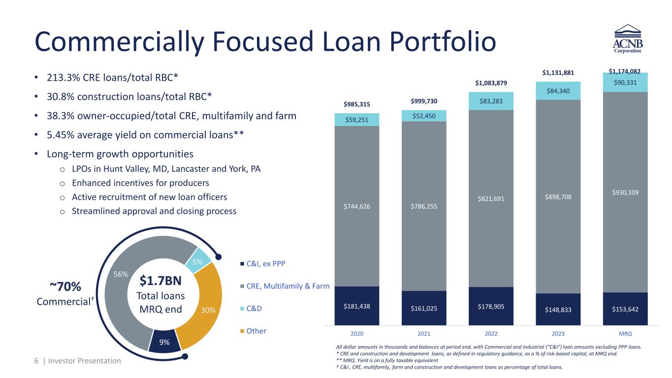 5 | Investor Presentation Experienced Management Team James P. Helt President & Chief Executive Officer . 35 years In financial services 16 years At ACNB Mark Blacksten EVP, Maryland Market President 34 years In financial services 1 year At ACNB Brett D. Fulk EVP, Chief Strategy Officer 33 years In financial services 2 years At ACNB Laurie A. Laub EVP, Chief Credit & Operations Officer 22 years In financial services 19 years At ACNB Douglas A. Seibel EVP, Chief Lending and Revenue Officer 42 years In financial services 16 years At ACNB Jason H. Weber EVP, Treasurer & Chief Financial Officer 26 years In financial services 2 years At ACNB Kevin J. Hayes SVP, General Counsel, Secretary and Chief Governance Officer 12 years In legal services 8 years At ACNB Emily E. Berwager SVP, Human Resources Manager . 25 years In human resources 4 years At ACNB 21 years In financial services 1 year At ACNB Andrew Bradley SVP, Chief Risk Officer