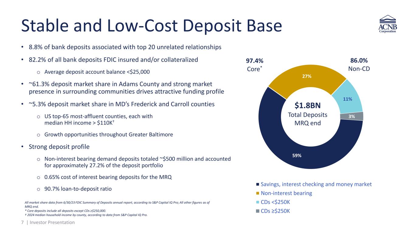 6 | Investor Presentation ~70% Commercial† Commercially Focused Loan Portfolio • 213.3% CRE loans/total RBC* • 30.8% construction loans/total RBC* • 38.3% owner-occupied/total CRE, multifamily and farm • 5.45% average yield on commercial loans** • Long-term growth opportunities o LPOs in Hunt Valley, MD, Lancaster and York, PA o Enhanced incentives for producers o Active recruitment of new loan officers o Streamlined approval and closing process All dollar amounts in thousands and balances at period end, with Commercial and Industrial (“C&I”) loan amounts excluding PPP loans. * CRE and construction and development loans, as defined in regulatory guidance, as a % of risk-based capital, at MRQ end. ** MRQ. Yield is on a fully taxable equivalent † C&I , CRE, multifamily, farm and construction and development loans as percentage of total loans. $1.7BN Total loans MRQ end $181,438 $161,025 $178,905 $148,833 $153,642 $744,626 $786,255 $821,691 $898,708 $930,109 $59,251 $52,450 $83,283 $84,340 $90,331 $985,315 $999,730 $1,083,879 $1,131,881 $1,174,082 2020 2021 2022 2023 MRQ 9% 56% 5% 30% C&I, ex PPP CRE, Multifamily & Farm C&D Other