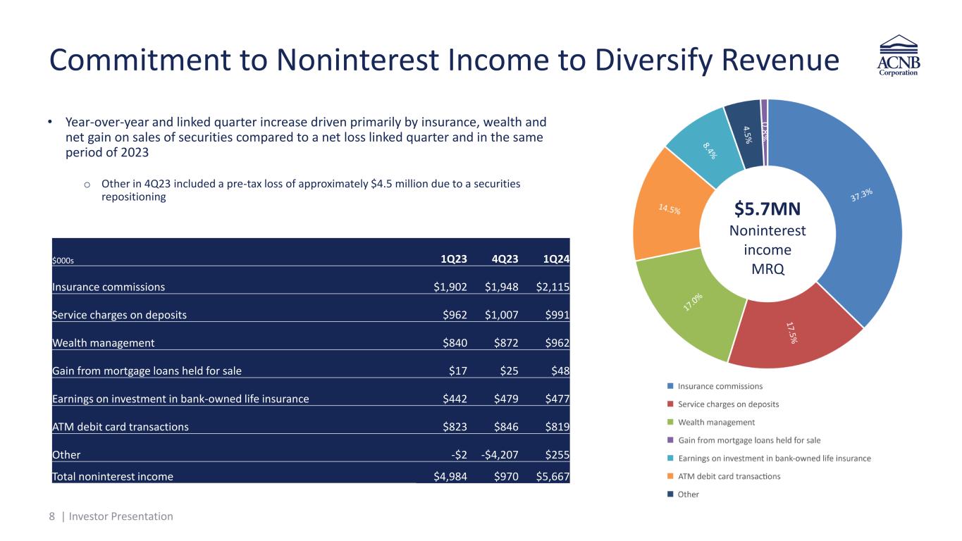 7 | Investor Presentation Stable and Low-Cost Deposit Base • 8.8% of bank deposits associated with top 20 unrelated relationships • 82.2% of all bank deposits FDIC insured and/or collateralized o Average deposit account balance <$25,000 • ~61.3% deposit market share in Adams County and strong market presence in surrounding communities drives attractive funding profile • ~5.3% deposit market share in MD’s Frederick and Carroll counties o US top-65 most-affluent counties, each with median HH income > $110K† o Growth opportunities throughout Greater Baltimore • Strong deposit profile o Non-interest bearing demand deposits totaled ~$500 million and accounted for approximately 27.2% of the deposit portfolio o 0.65% cost of interest bearing deposits for the MRQ o 90.7% loan-to-deposit ratio All market share data from 6/30/23 FDIC Summary of Deposits annual report, according to S&P Capital IQ Pro; All other figures as of MRQ end. * Core deposits include all deposits except CDs ≥$250,000. † 2024 median household income by county, according to data from S&P Capital IQ Pro. 97.4% Core* $1.8BN Total Deposits MRQ end 86.0% Non-CD 59% 27% 11% 3% Savings, interest checking and money market Non-interest bearing CDs <$250K CDs ≥$250K