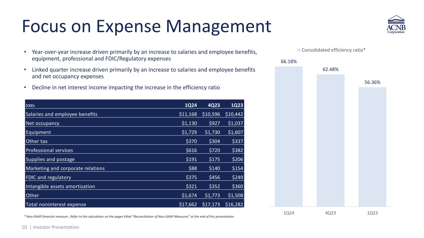 9 | Investor Presentation Fee-Generating Offerings All dollar amounts in thousands. * Income from fiduciary, investment management and brokerage activities. ** Non-GAAP financial measure ; Refer to the calculation on the pages titled “Reconciliation of Non-GAAP Measures” at the end of this presentation. In su ra n ce W e al th To ta l N o n in te re st In co m e $6,339 $6,165 $6,151 $8,307 $9,319 $47,735 $47,943 $46,508 $52,994 $61,180 2019 2020 2021 2022 2023 Insurance commissions Gross premium volume $2,469 $2,672 $3,169 $3,160 $3,644 $389,000 $436,700 $537,800 $518,800 $639,400 2019 2020 2021 2022 2023 Wealth management fees* AUM/AUA (period-end) $17,902 $20,283 $22,236 $21,918 $23,330 23.15% 21.73% 23.79% 20.81% 20.90% 2019 2020 2021 2022 2023 Total noninterest income Total noninterest income/revenue**