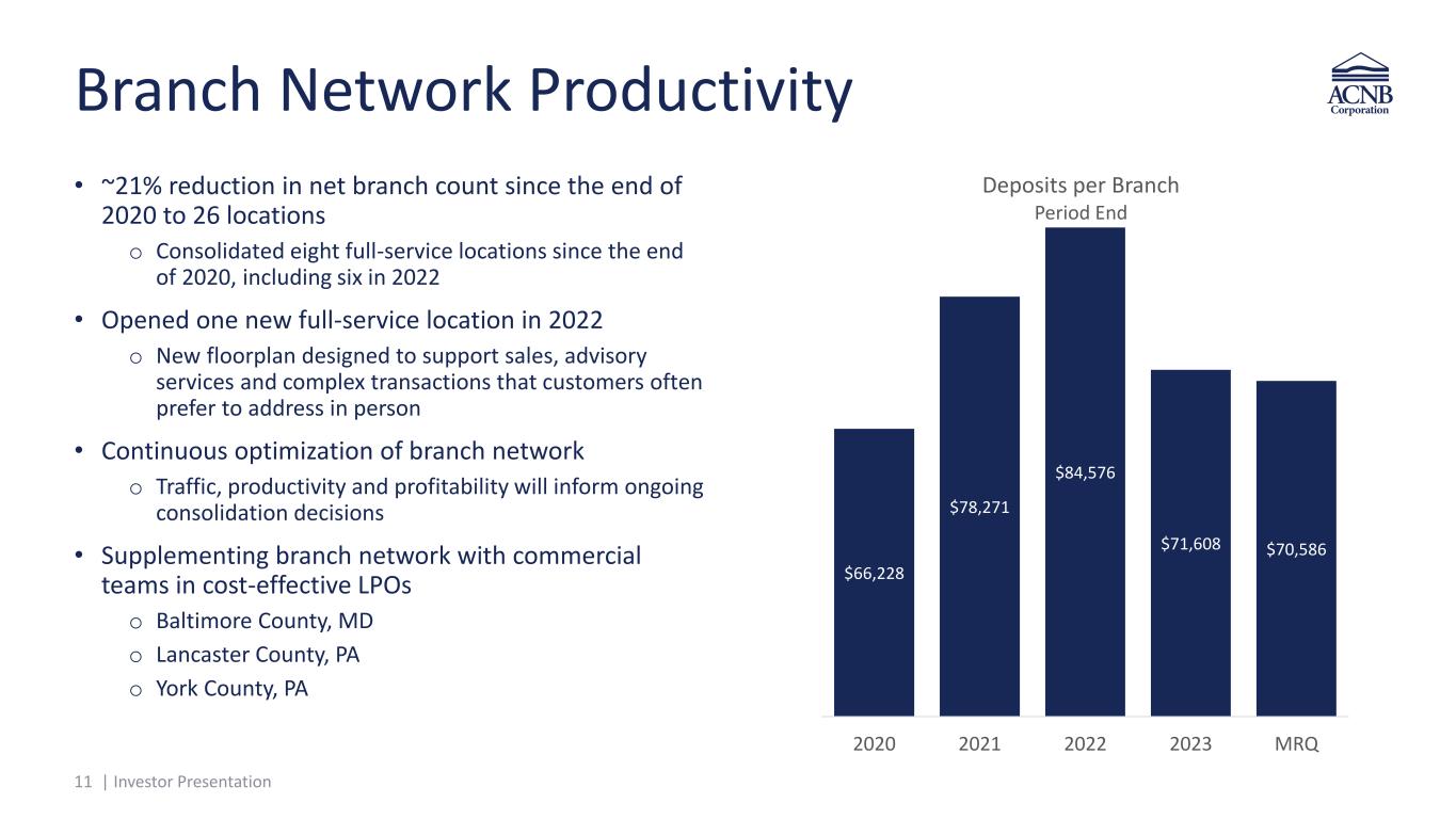 10 | Investor Presentation Focus on Expense Management * Non-GAAP financial measure ; Refer to the calculation on the pages titled “Reconciliation of Non-GAAP Measures” at the end of this presentation. • Year-over-year increase driven primarily by an increase to salaries and employee benefits, equipment, professional and FDIC/Regulatory expenses • Linked quarter increase driven primarily by an increase to salaries and employee benefits and net occupancy expenses • Decline in net interest income impacting the increase in the efficiency ratio $000s 1Q24 4Q23 1Q23 Salaries and employee benefits $11,168 $10,596 $10,442 Net occupancy $1,130 $927 $1,037 Equipment $1,729 $1,730 $1,607 Other tax $370 $304 $337 Professional services $616 $720 $382 Supplies and postage $191 $175 $206 Marketing and corporate relations $88 $140 $154 FDIC and regulatory $375 $456 $249 Intangible assets amortization $321 $352 $360 Other $1,674 $1,773 $1,508 Total noninterest expense $17,662 $17,173 $16,282 66.18% 62.48% 56.36% 1Q24 4Q23 1Q23 Consolidated efficiency ratio*