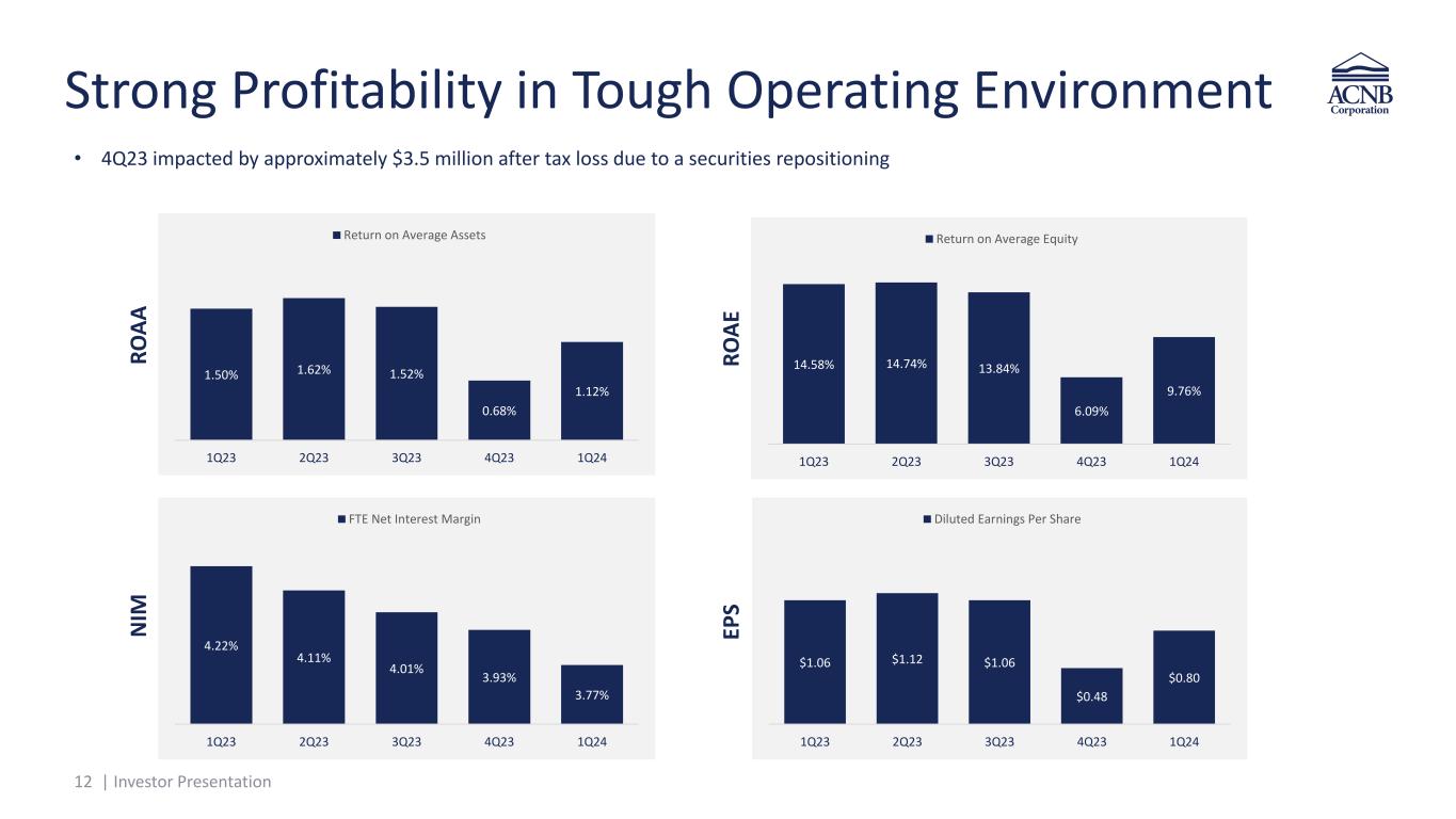11 | Investor Presentation Branch Network Productivity • ~21% reduction in net branch count since the end of 2020 to 26 locations o Consolidated eight full-service locations since the end of 2020, including six in 2022 • Opened one new full-service location in 2022 o New floorplan designed to support sales, advisory services and complex transactions that customers often prefer to address in person • Continuous optimization of branch network o Traffic, productivity and profitability will inform ongoing consolidation decisions • Supplementing branch network with commercial teams in cost-effective LPOs o Baltimore County, MD o Lancaster County, PA o York County, PA $66,228 $78,271 $84,576 $71,608 $70,586 2020 2021 2022 2023 MRQ Deposits per Branch Period End
