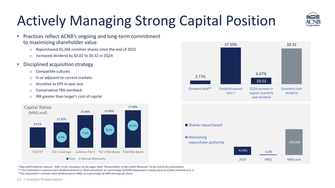 12 | Investor Presentation Strong Profitability in Tough Operating Environment • 4Q23 impacted by approximately $3.5 million after tax loss due to a securities repositioning R O A A R O A E N IM EP S 1.50% 1.62% 1.52% 0.68% 1.12% 1Q23 2Q23 3Q23 4Q23 1Q24 Return on Average Assets 14.58% 14.74% 13.84% 6.09% 9.76% 1Q23 2Q23 3Q23 4Q23 1Q24 Return on Average Equity 4.22% 4.11% 4.01% 3.93% 3.77% 1Q23 2Q23 3Q23 4Q23 1Q24 FTE Net Interest Margin $1.06 $1.12 $1.06 $0.48 $0.80 1Q23 2Q23 3Q23 4Q23 1Q24 Diluted Earnings Per Share