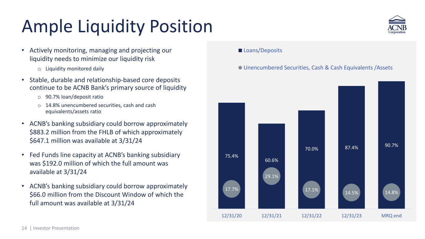 13 | Investor Presentation Actively Managing Strong Capital Position • Practices reflect ACNB’s ongoing and long-term commitment to maximizing shareholder value o Repurchased 65,266 common shares since the end of 2022 o Increased dividend by $0.02 to $0.32 in 2Q24 • Disciplined acquisition strategy o Compatible cultures o In or adjacent to current markets o Accretive to EPS in year one o Conservative TBV earnback o IRR greater than target’s cost of capital * Non-GAAP financial measure ; Refer to the calculation on the pages titled “Reconciliation of Non-GAAP Measures” at the end of this presentation. ** The Corporation’s common stock dividend declared in 2Q24, annualized, as a percentage of ACNB Corporation’s closing share as of date provided on p. 2. † The Corporation’s common stock dividend paid in MRQ, as a percentage of MRQ earnings per share. 61,066 4,200 190,309 2023 MRQ MRQ end Shares repurchased Remaining repurchase authority 9.61% 11.91% 15.40% 15.69% 17.68% 5.0% 7.0% 8.5% 10.5% TCE/TA* Tier 1 Leverage Common Tier 1 Tier 1 Risk-Based Total Risk Based Capital Ratios (MRQ end) Corp Internal Minimums 3.77% 37.50% 6.67% $0.02 $0.32 Dividend yield** Dividend payout ratio † 2Q24 increase in regular quarterly cash dividend Quarterly cash dividend