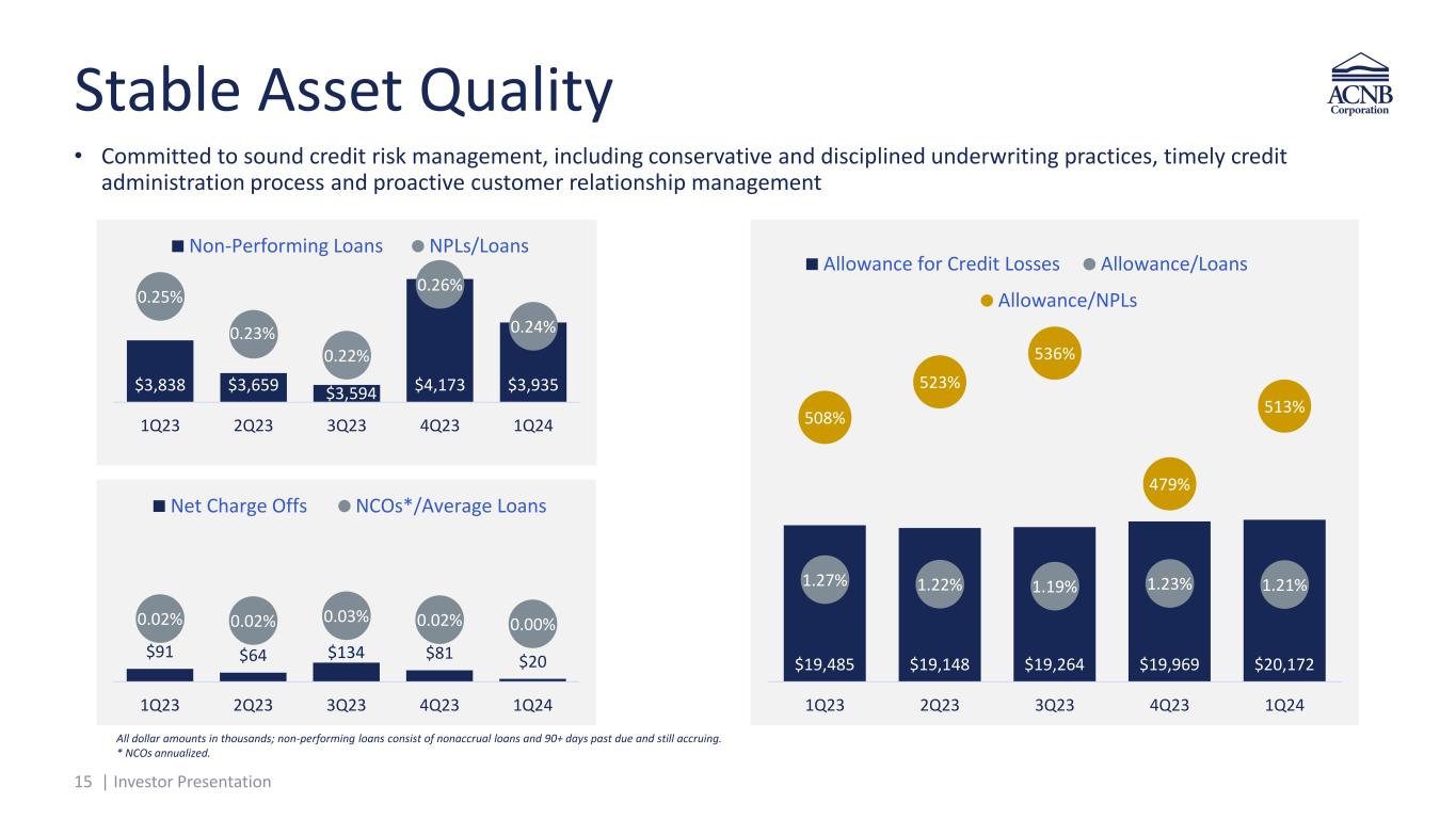 14 | Investor Presentation Ample Liquidity Position • Actively monitoring, managing and projecting our liquidity needs to minimize our liquidity risk o Liquidity monitored daily • Stable, durable and relationship-based core deposits continue to be ACNB Bank’s primary source of liquidity o 90.7% loan/deposit ratio o 14.8% unencumbered securities, cash and cash equivalents/assets ratio • ACNB’s banking subsidiary could borrow approximately $883.2 million from the FHLB of which approximately $647.1 million was available at 3/31/24 • Fed Funds line capacity at ACNB’s banking subsidiary was $192.0 million of which the full amount was available at 3/31/24 • ACNB’s banking subsidiary could borrow approximately $66.0 million from the Discount Window of which the full amount was available at 3/31/24 75.4% 60.6% 70.0% 87.4% 90.7% 17.7% 29.1% 17.1% 14.5% 14.8% 12/31/20 12/31/21 12/31/22 12/31/23 MRQ end Loans/Deposits Unencumbered Securities, Cash & Cash Equivalents /Assets