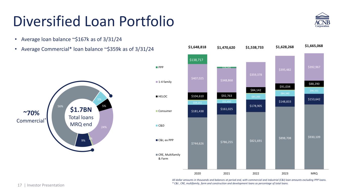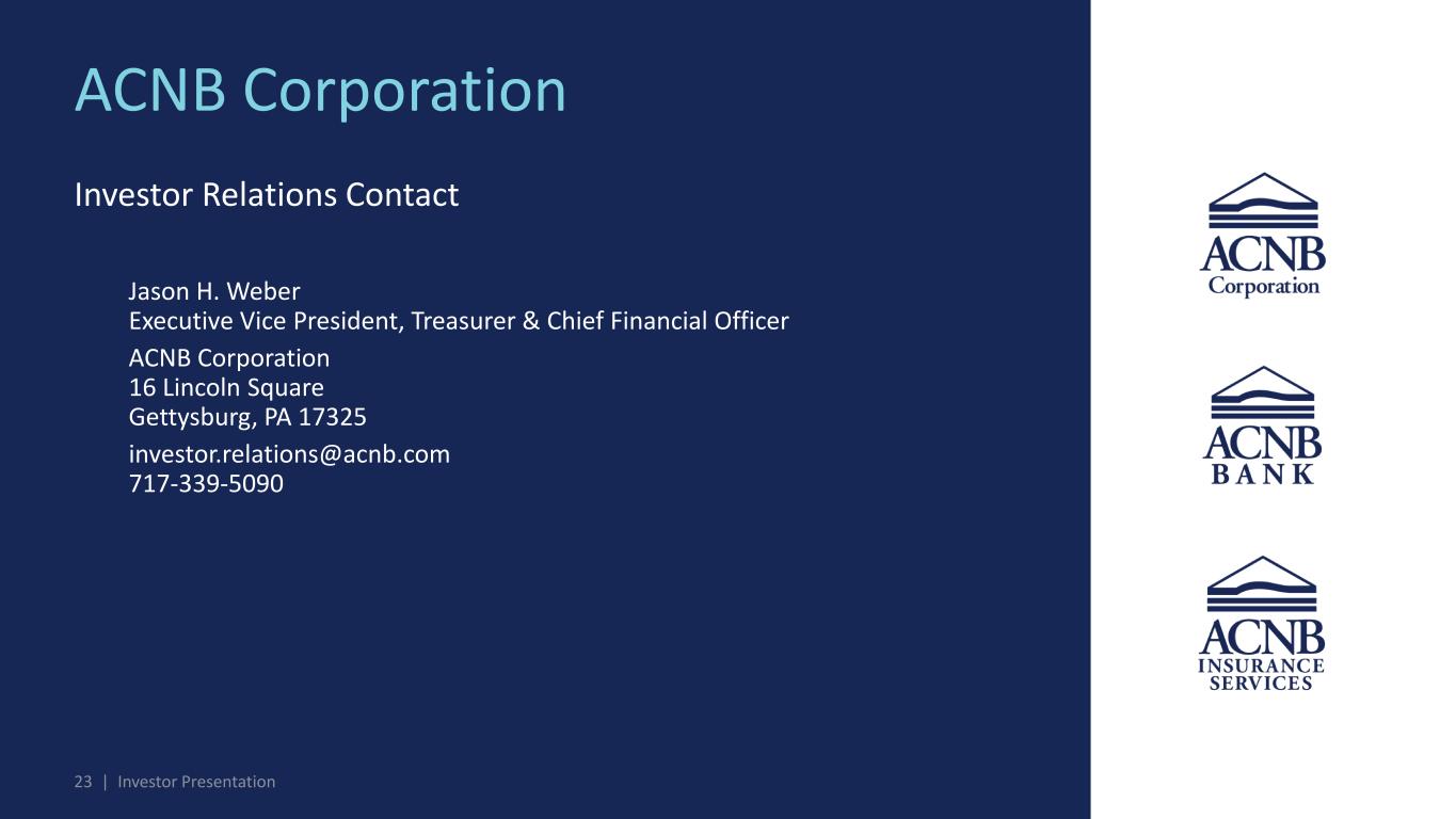 23 | Investor Presentation ACNB Corporation Investor Relations Contact Jason H. Weber Executive Vice President, Treasurer & Chief Financial Officer ACNB Corporation 16 Lincoln Square Gettysburg, PA 17325 investor.relations@acnb.com 717-339-5090 Investor Presentation
