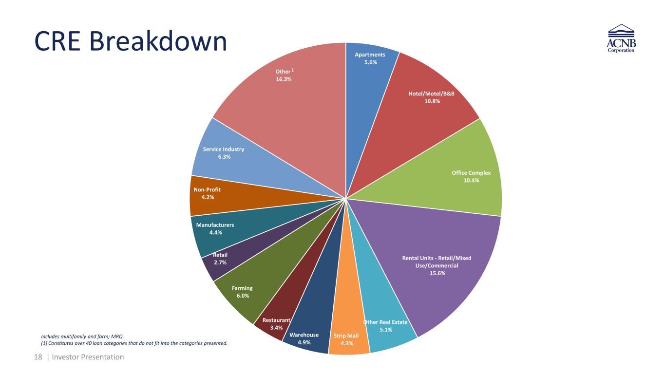 18 | Investor Presentation Apartments 5.6% Hotel/Motel/B&B 10.8% Office Complex 10.4% Rental Units - Retail/Mixed Use/Commercial 15.6% Other Real Estate 5.1% Strip Mall 4.3% Warehouse 4.9% Restaurant 3.4% Farming 6.0% Retail 2.7% Manufacturers 4.4% Non-Profit 4.2% Service Industry 6.3% Other 16.3% CRE Breakdown Includes multifamily and farm; MRQ. (1) Constitutes over 40 loan categories that do not fit into the categories presented. 1