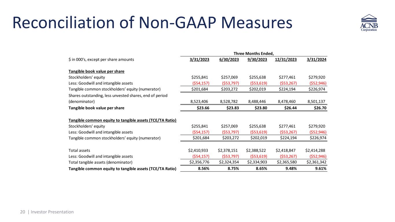 19 | Investor Presentation This presentation contains financial measures determined by methods other than in accordance with accounting principles generally accepted in the United States (GAAP). The Corporation has presented the following non-GAAP financial measures because it believes that these measures provide useful and comparative information to assess trends in the Corporations' results of operations and financial condition. Please note that although non-GAAP financial measures provide useful insight to analysts, investors and regulators, they should not be considered in isolation or relied upon as a substitute for analysis using GAAP financial measures. Reconciliation of Non-GAAP Measures 19
