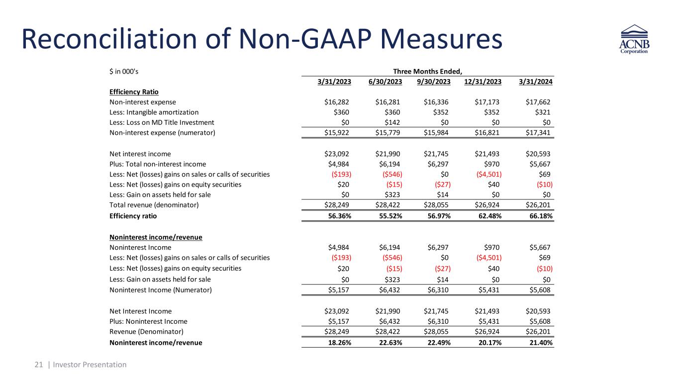 20 | Investor Presentation Reconciliation of Non-GAAP Measures 20 $ in 000's, except per share amounts 3/31/2023 6/30/2023 9/30/2023 12/31/2023 3/31/2024 Tangible book value per share Stockholders' equity $255,841 $257,069 $255,638 $277,461 $279,920 Less: Goodwill and intangible assets ($54,157) ($53,797) ($53,619) ($53,267) ($52,946) Tangible common stockholders’ equity (numerator) $201,684 $203,272 $202,019 $224,194 $226,974 Shares outstanding, less unvested shares, end of period (denominator) 8,523,406 8,528,782 8,488,446 8,478,460 8,501,137 Tangible book value per share $23.66 $23.83 $23.80 $26.44 $26.70 Tangible common equity to tangible assets (TCE/TA Ratio) Stockholders' equity $255,841 $257,069 $255,638 $277,461 $279,920 Less: Goodwill and intangible assets ($54,157) ($53,797) ($53,619) ($53,267) ($52,946) Tangible common stockholders’ equity (numerator) $201,684 $203,272 $202,019 $224,194 $226,974 Total assets $2,410,933 $2,378,151 $2,388,522 $2,418,847 $2,414,288 Less: Goodwill and intangible assets ($54,157) ($53,797) ($53,619) ($53,267) ($52,946) Total tangible assets (denominator) $2,356,776 $2,324,354 $2,334,903 $2,365,580 $2,361,342 Tangible common equity to tangible assets (TCE/TA Ratio) 8.56% 8.75% 8.65% 9.48% 9.61% Three Months Ended,